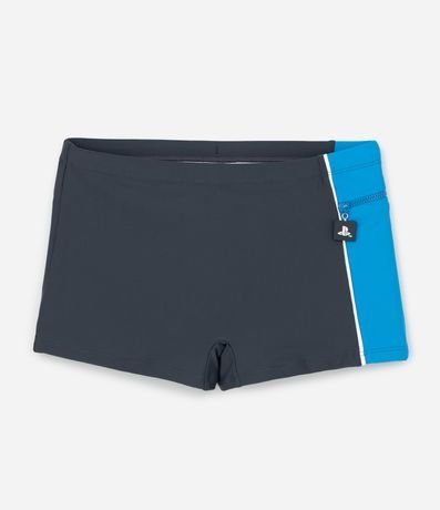 Sunga infantil confeccionada em microfibra no modelo boxer. Possui cós ajustável por cordinha, lateral contrastante com zíper Playstation.