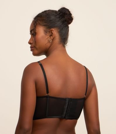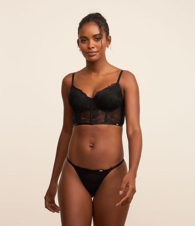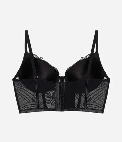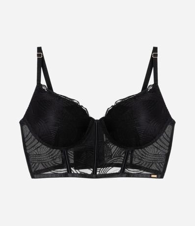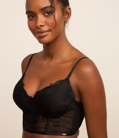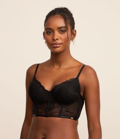 Ref: Sutiã alongado feminino, confeccionado em renda, com bojo, alças reguláveis e bordados na superfície.