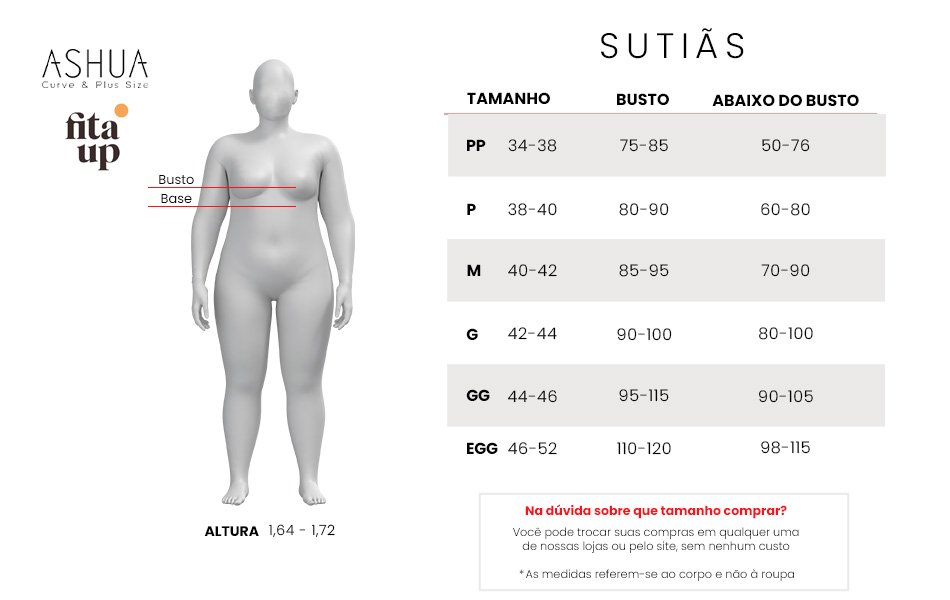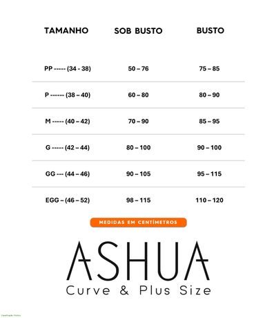 Na Ashua, você encontra peças desenhadas especialmente para valorizar as suas curvas. Cada mulher tem seu estilo, seu corpo e sua forma de se sentir mais bonita. Umas chamam de Plus Size, mas nós preferimos Curve Size, porque acreditamos na força das curvas femininas.  Estamos disponíveis para atender trocas pelo site ou pelo contato: 3004-5030.