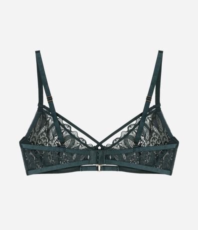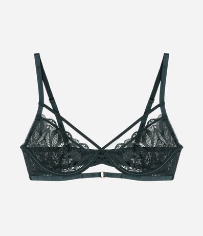 Sutiã sem bojo e com aro, confeccionado em renda floral, com detalhes em tiras.