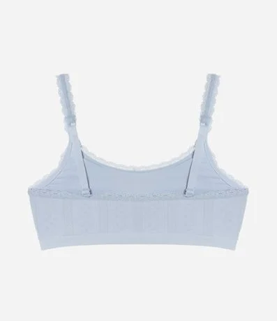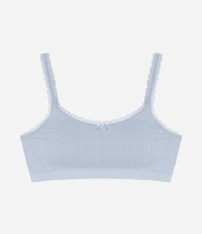 Sutiã top com bojos removíveis, alças reguláveis, aplicação de renda delicada e superfície texturizada.