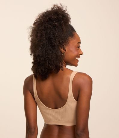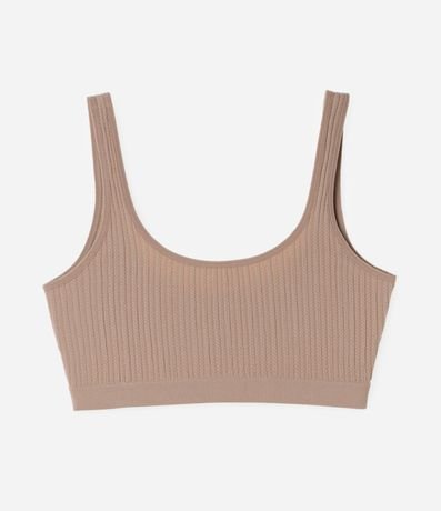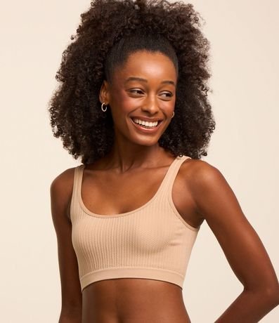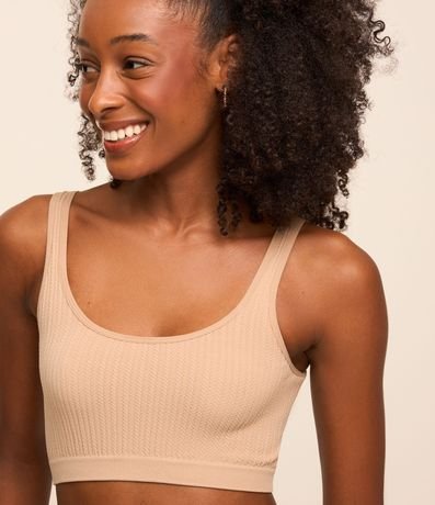 Ref: Sutiã top em poliamida, sem bojo e aro, com decote redondo, alças médias e textura canelada.