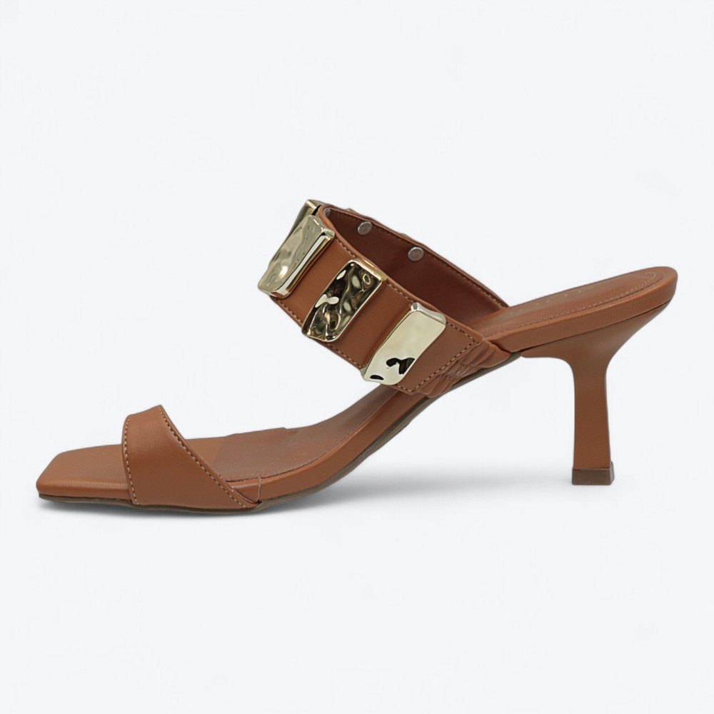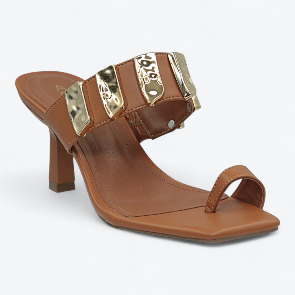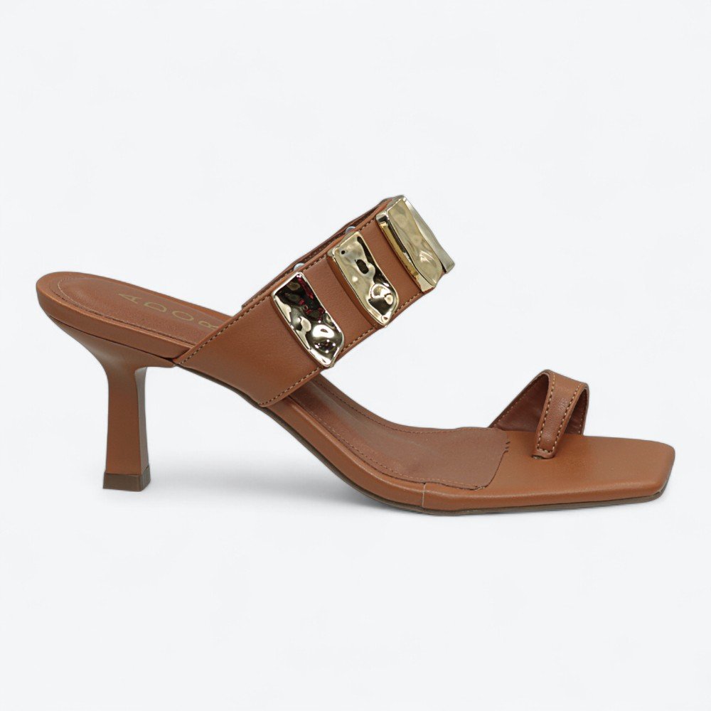Elegante e atual, este tamanco Adora une duas tiras: uma frontal com anel para o dedo e outra larga no peito do pé com aplicações metalizadas que elevam o visual. O salto médio fino (estilo taça) alonga a silhueta com leveza, enquanto o bico quadrado e a palmilha macia garantem conforto para acompanhar você do trabalho ao happy hour.
