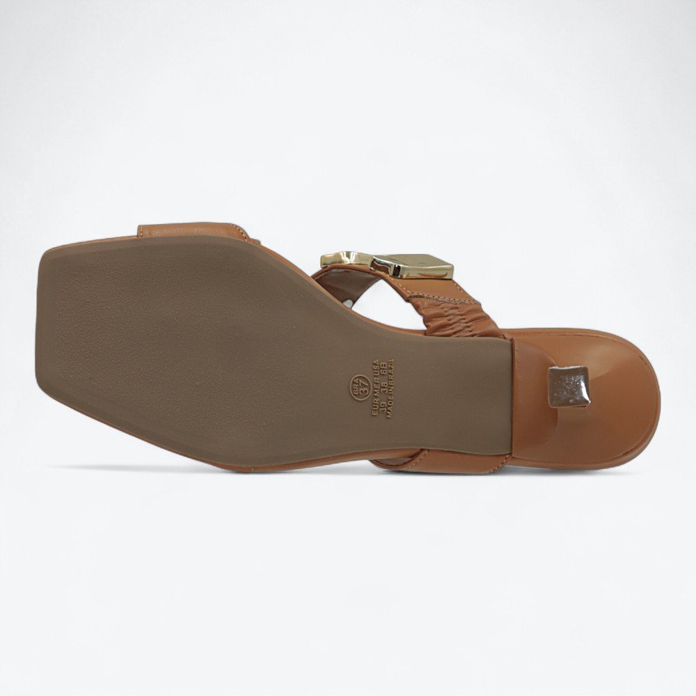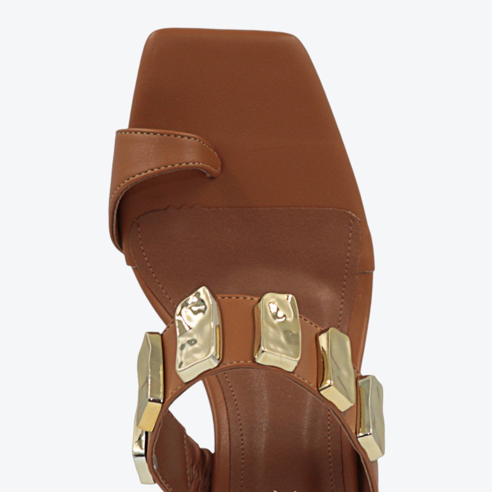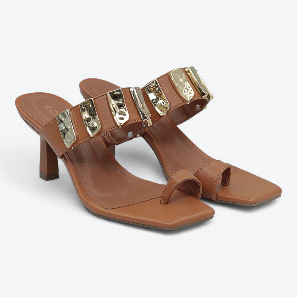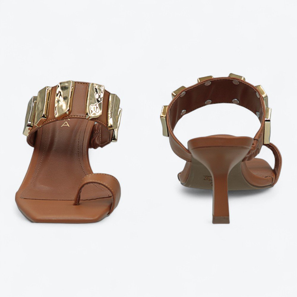 Elegante e atual, este tamanco Adora une duas tiras: uma frontal com anel para o dedo e outra larga no peito do pé com aplicações metalizadas que elevam o visual. O salto médio fino (estilo taça) alonga a silhueta com leveza, enquanto o bico quadrado e a palmilha macia garantem conforto para acompanhar você do trabalho ao happy hour.