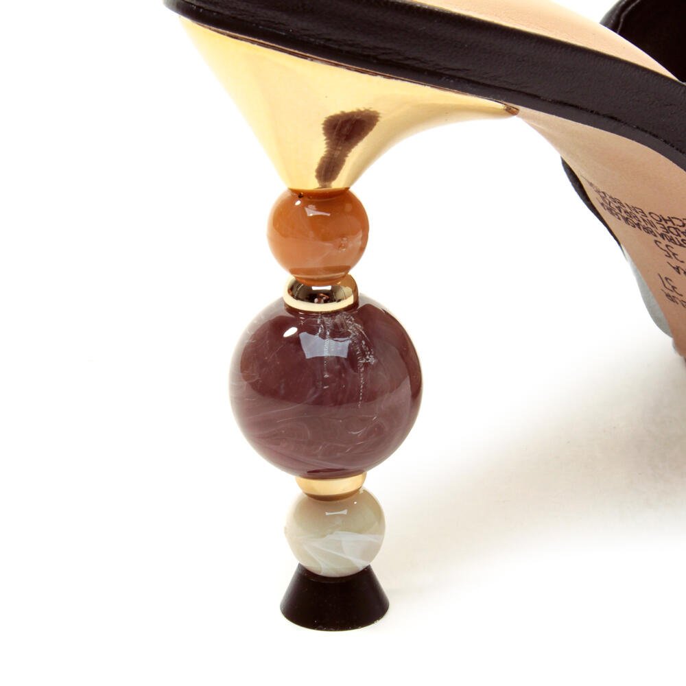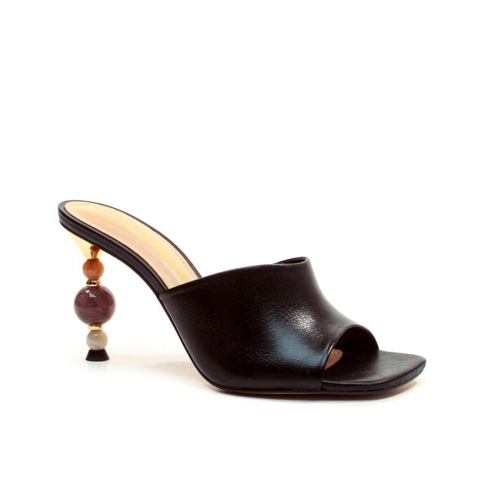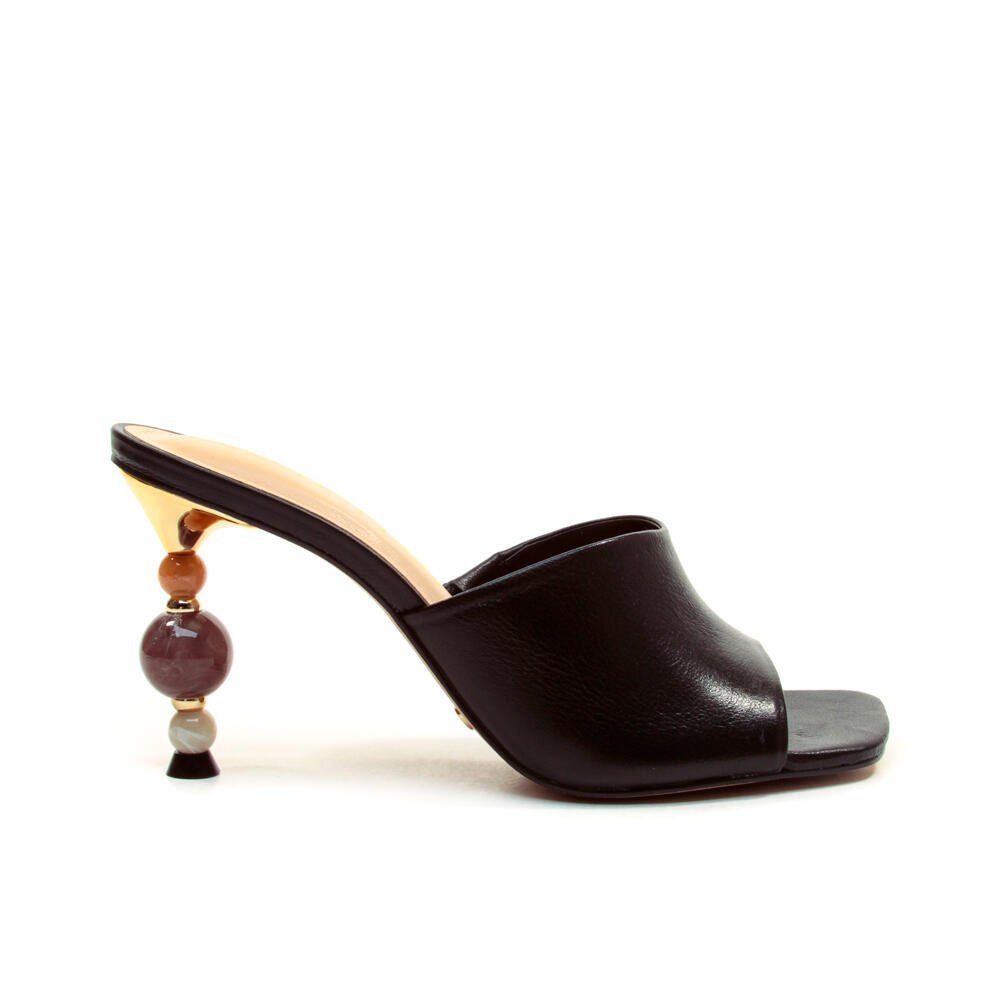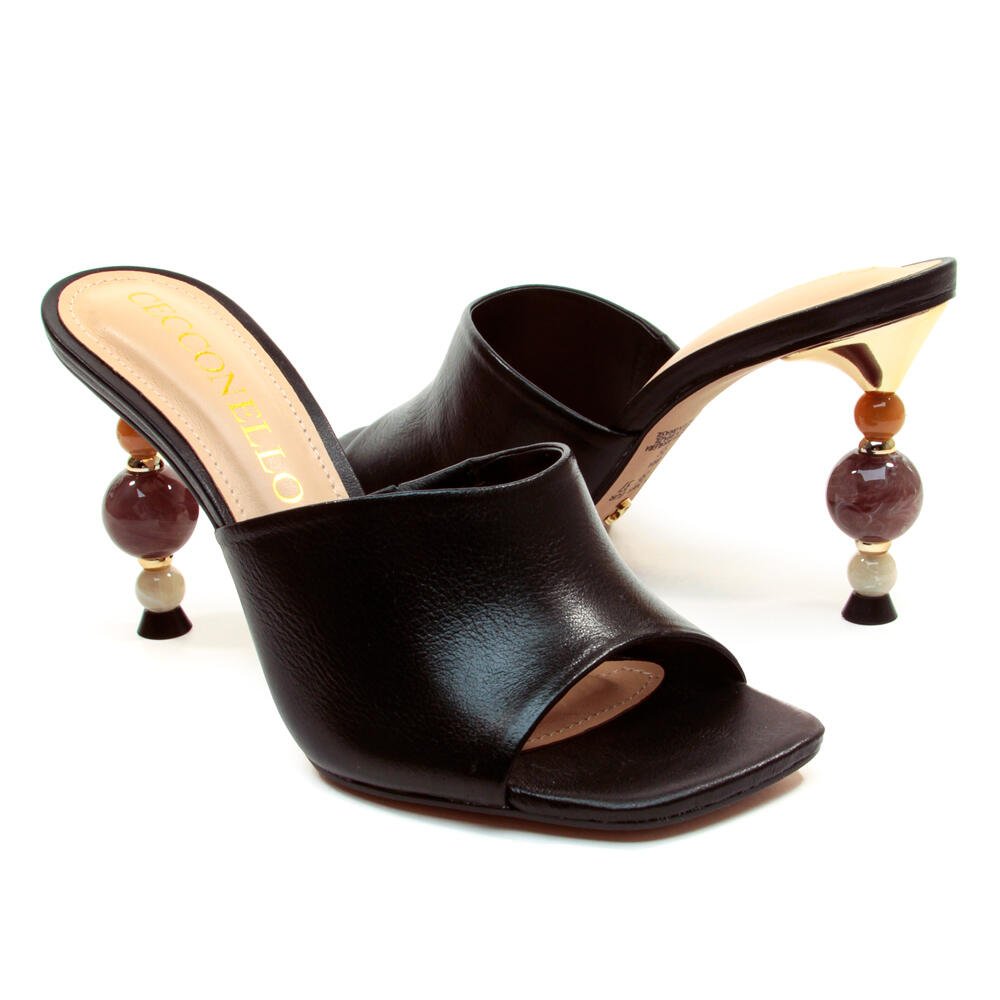 Ref: Elegância com um toque artístico. Esta mule em couro preto exibe um design minimalista de linhas limpas, equilibrado com o impacto visual do salto escultural formado por esferas em tons terrosos. A frente aberta e o bico quadrado garantem conforto e modernidade, enquanto o salto alto transforma o modelo em uma peça statement — ideal para elevar produções do dia à noite com sofisticação despretensiosa.
