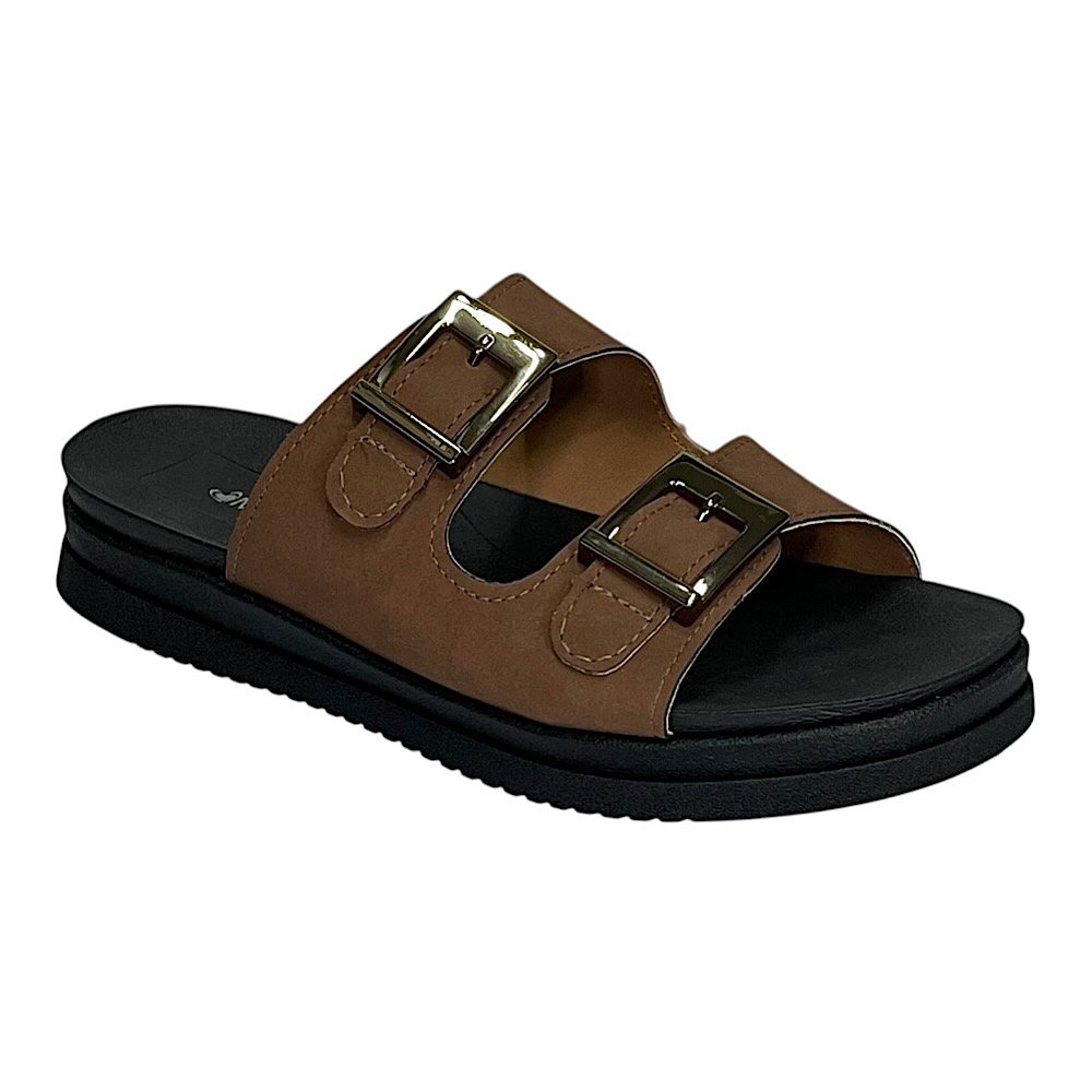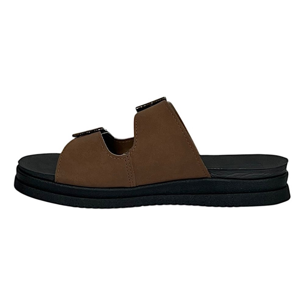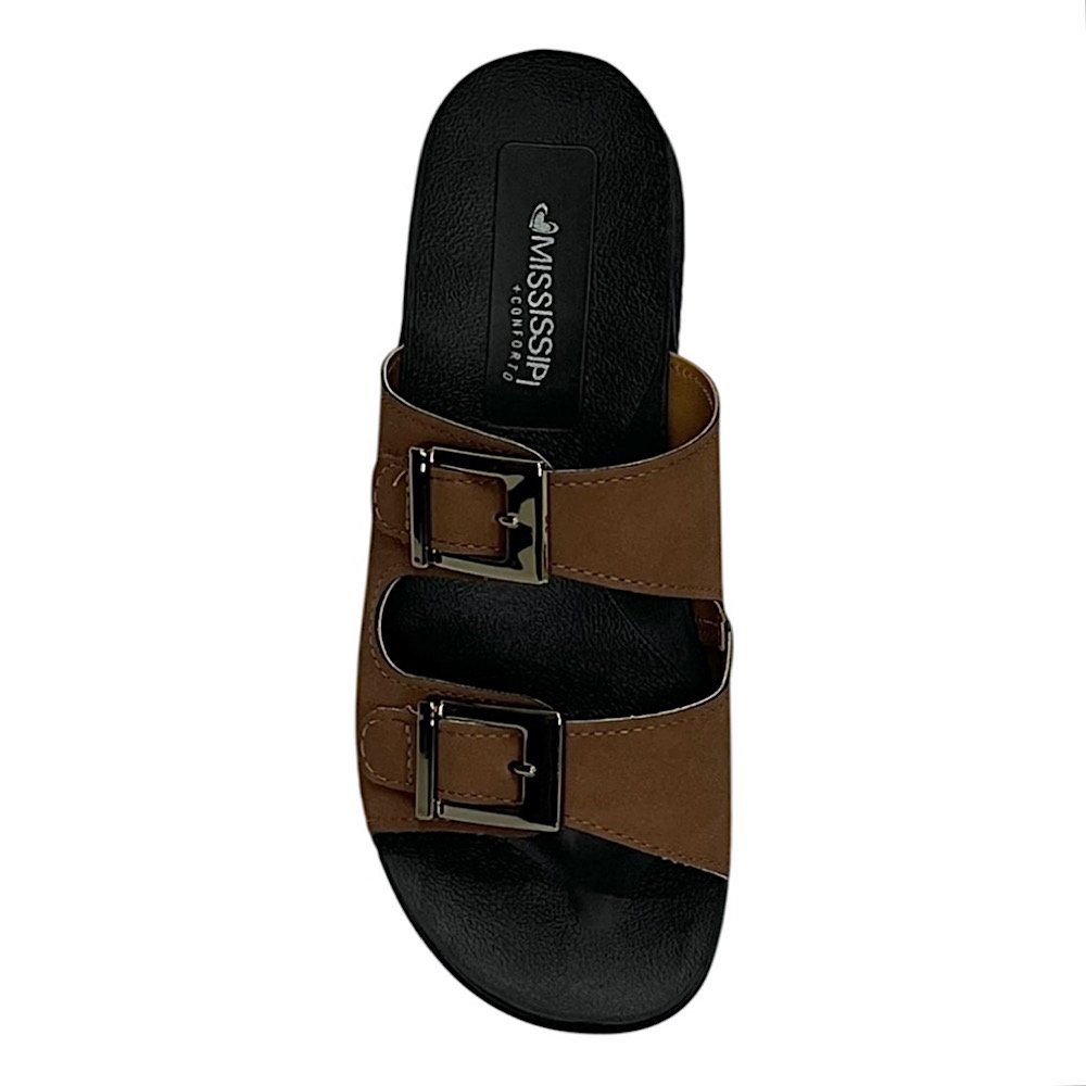 Ref: O Tamanco Slide Mississipi MF911 Marrom traduz o equilíbrio perfeito entre conforto e estilo, ideal para quem busca um visual moderno com um toque natural e elegante. Seu design com duas tiras largas e fivelas metalizadas douradas proporciona um charme discreto e sofisticado, enquanto a cor tabaco traz versatilidade e combina facilmente com diferentes tons e estilos de roupa.