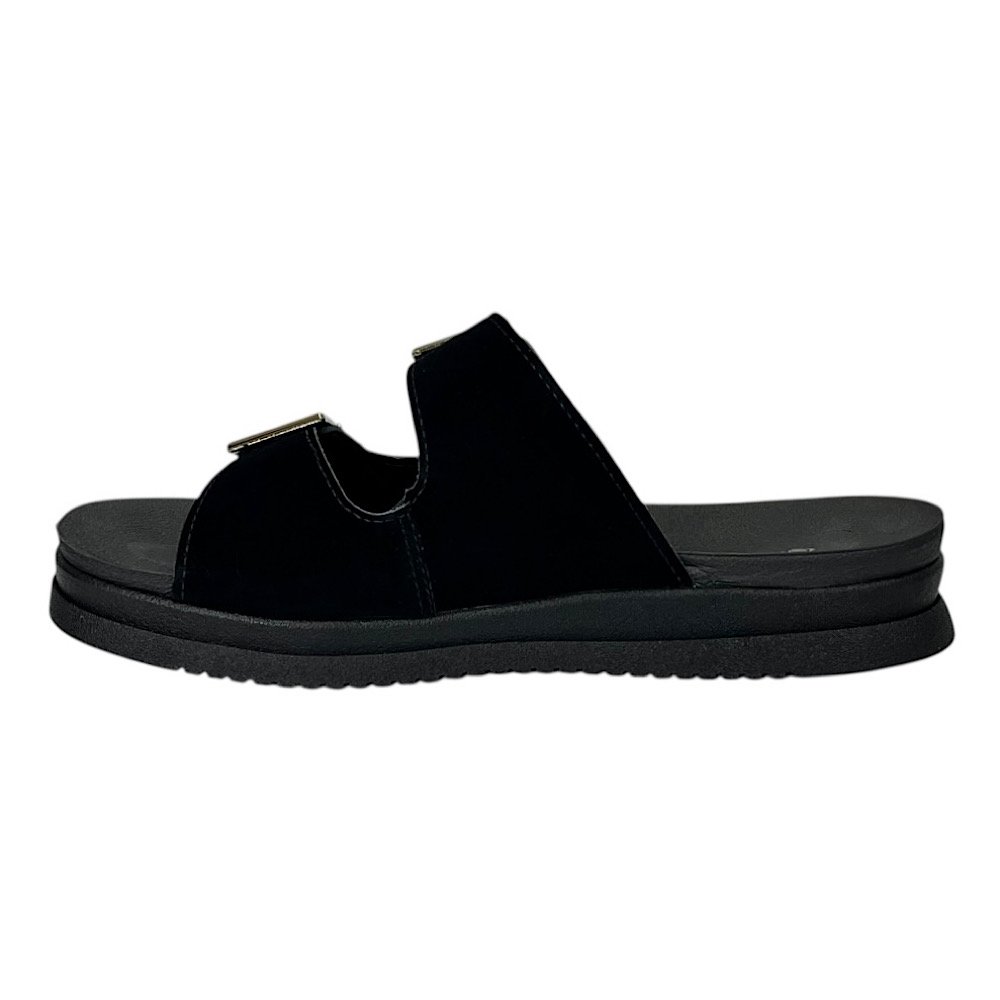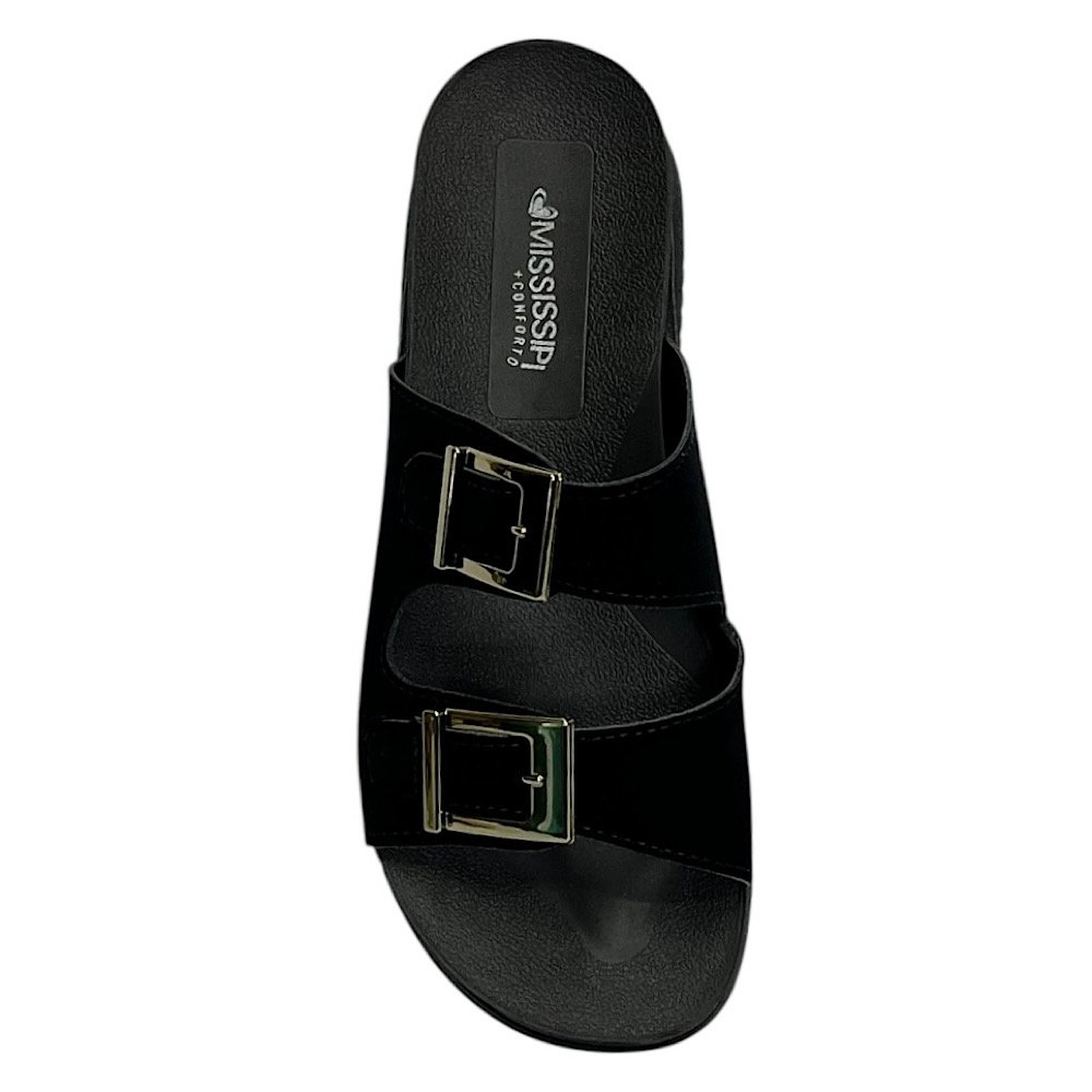 Ref: O Tamanco Slide Mississipi MF911 Preto é a escolha ideal para quem busca praticidade, conforto e estilo em um único calçado. Com um design moderno e atemporal, o modelo conta com duas tiras largas adornadas por fivelas metalizadas que adicionam um toque sofisticado e elegante ao visual. Produzido em material sintético de alta qualidade, garante durabilidade e um ótimo acabamento, além de ser fácil de limpar e perfeito para o uso no dia a dia.