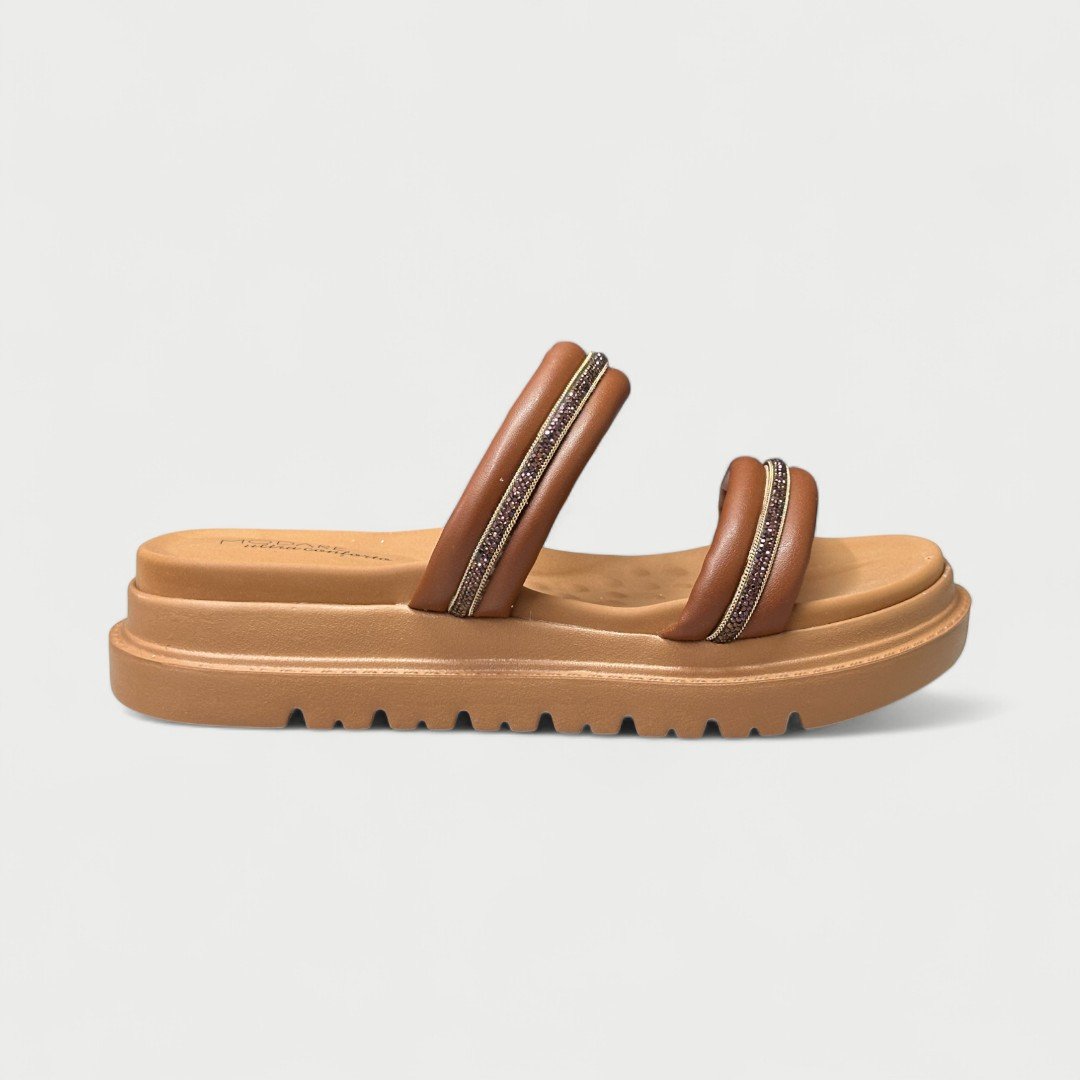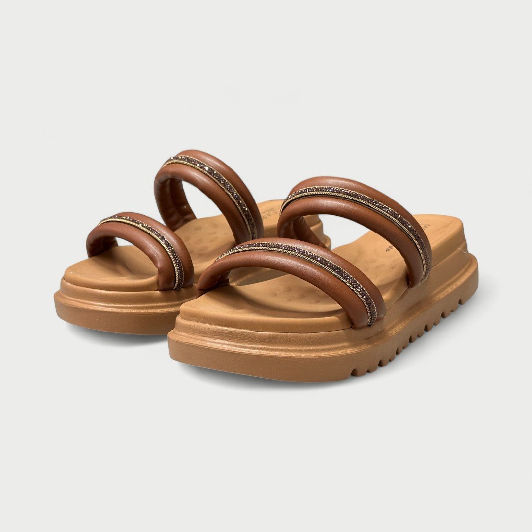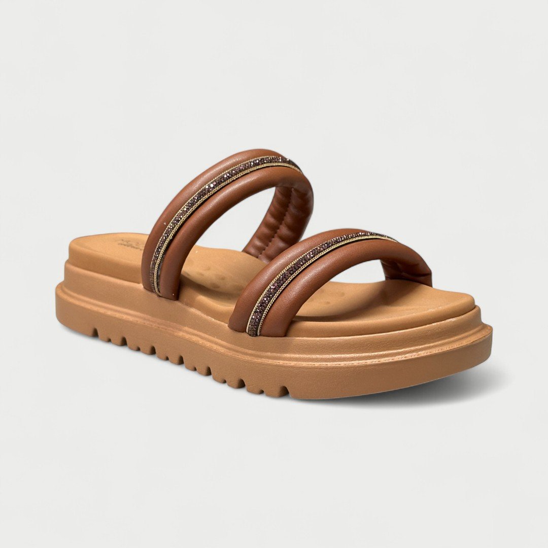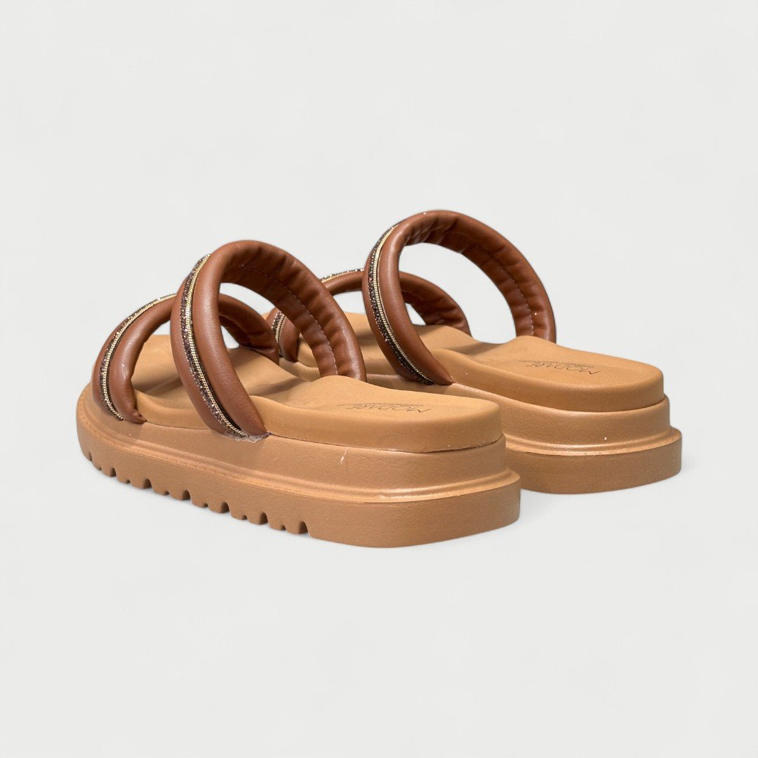 Estilo do produto: Tamanco feminino com duas tiras largas, detalhes em strass, modelo slide, plataforma flat e solado tratorado.