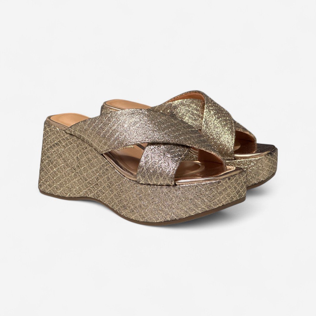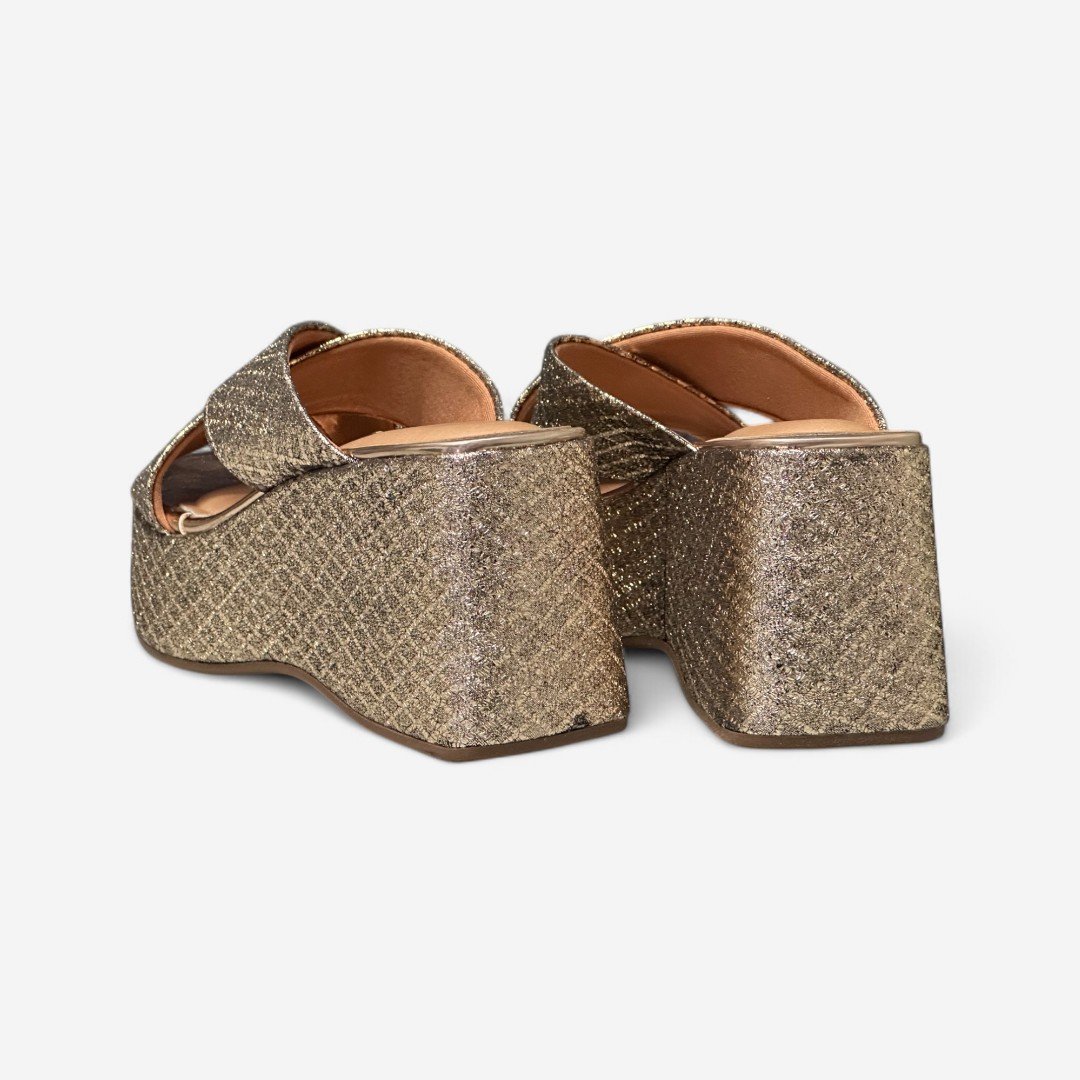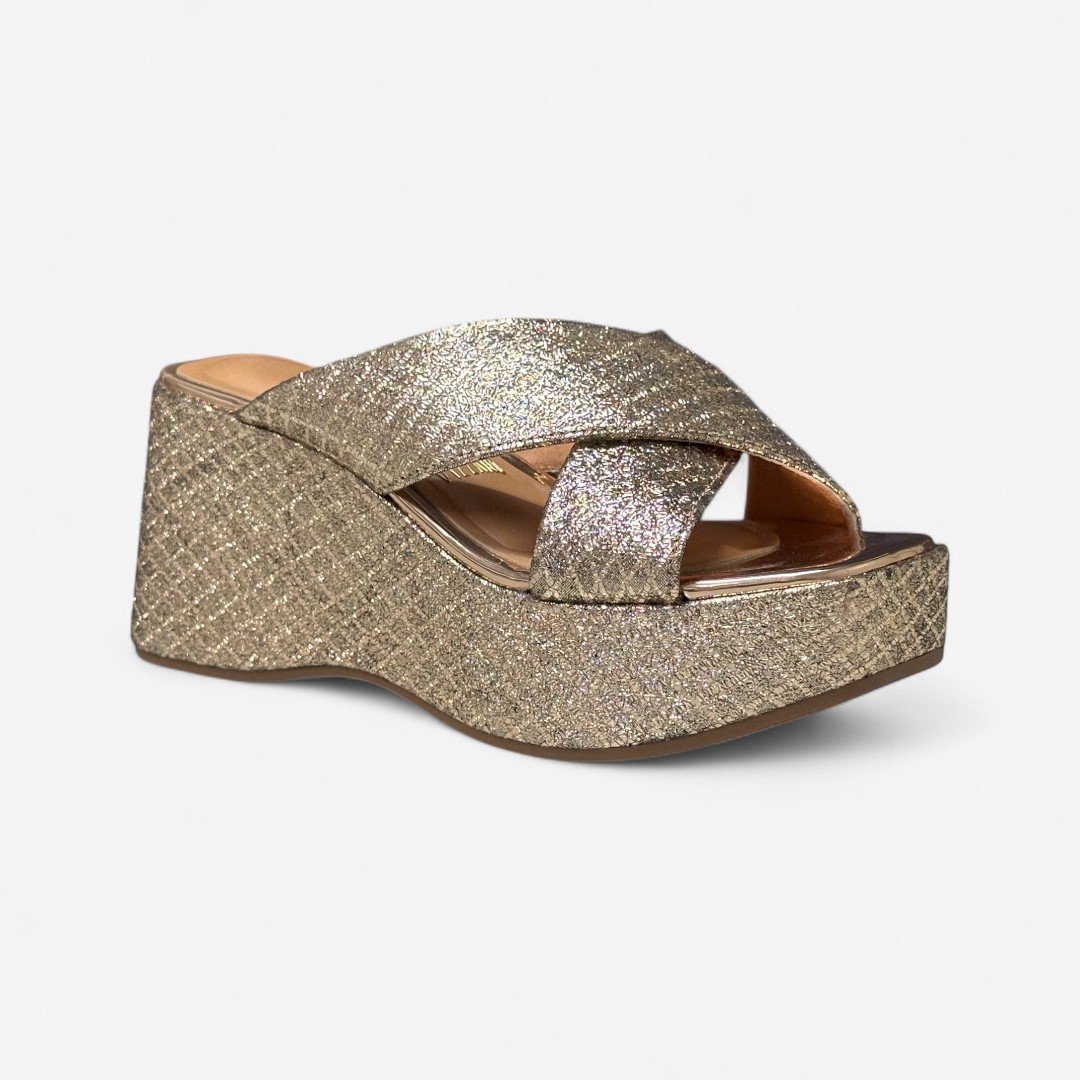 Detalhes: tiras largas cruzadas, acabamento metalizado brilhoso