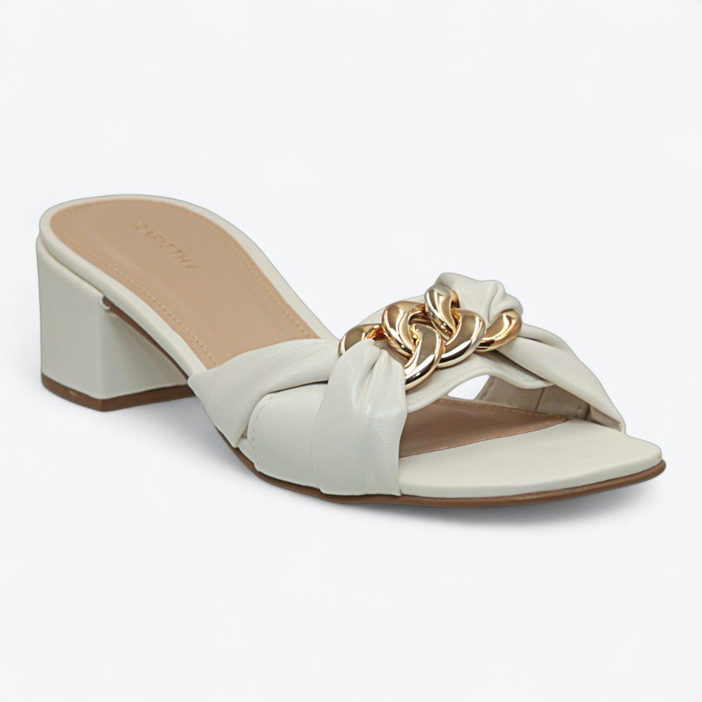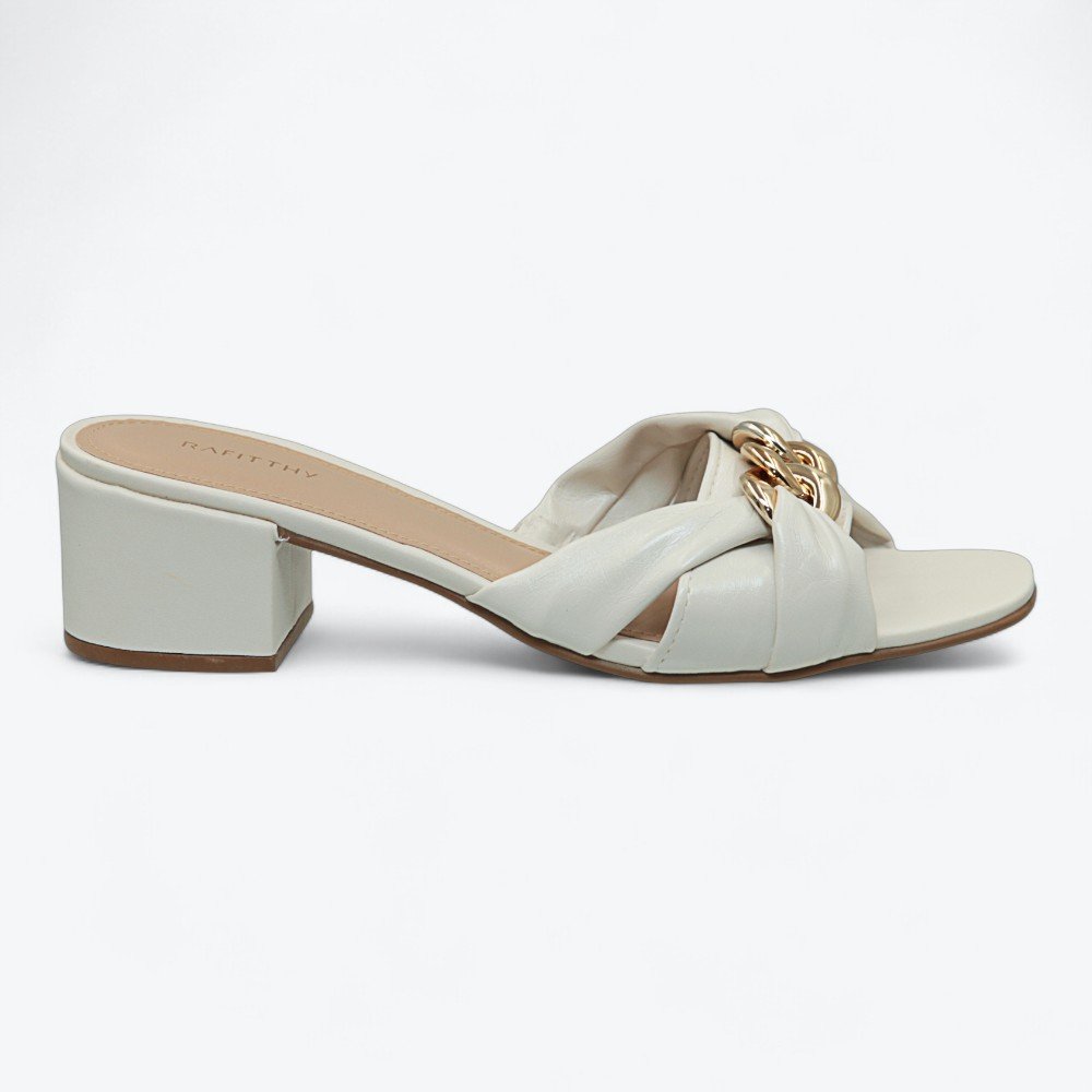 Ref: Tamanco feminino da marca Rafitthy, perfeito para quem gosta de estar arrumada com conforto no dia a dia. O modelo traz tiras largas com efeito torcido e aplicação de corrente metalizada, dando um toque moderno e elegante ao visual. O salto bloco de altura média garante estabilidade ao caminhar, enquanto a palmilha macia proporciona mais conforto para usar por horas.