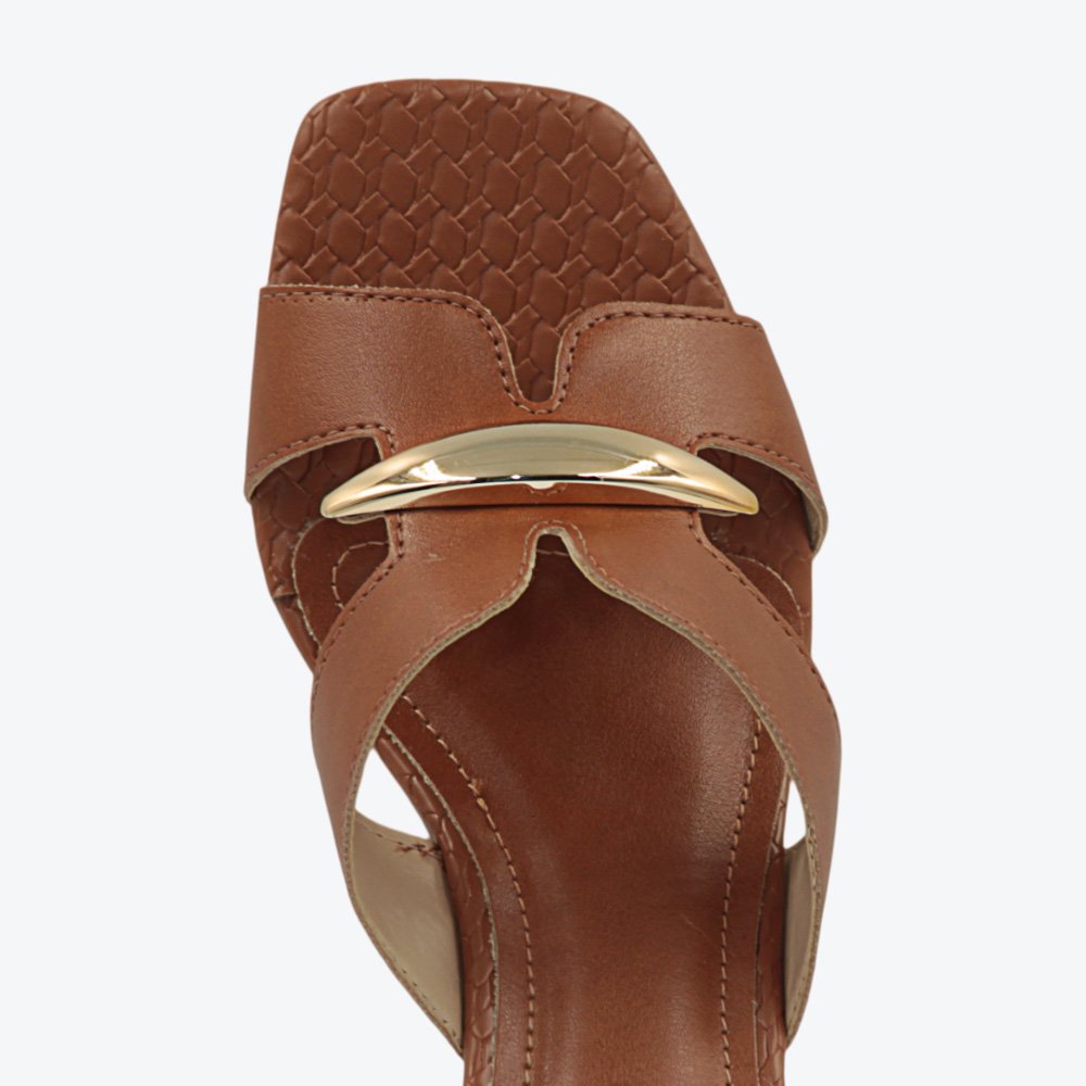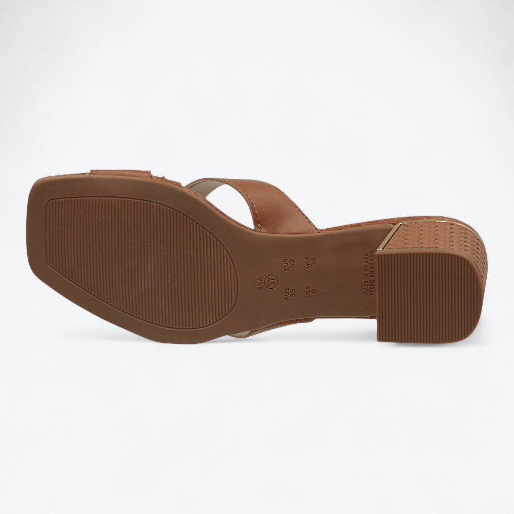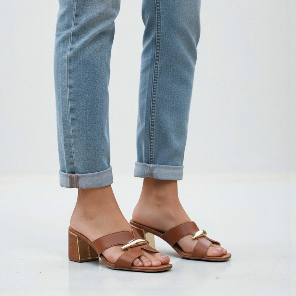 As tiras largas proporcionam segurança e um ajuste confortável, enquanto o aplique metálico no cabedal eleva o charme da peça. Ideal para compor looks casuais com muito estilo ou para dar um toque fashion a produções mais elaboradas.