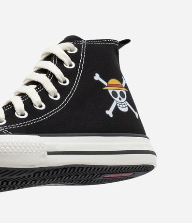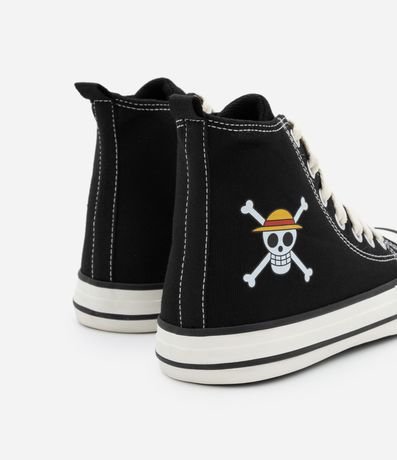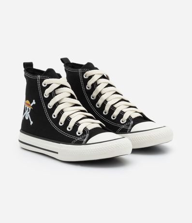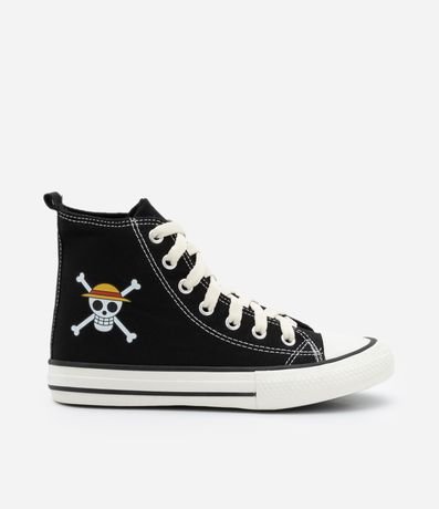 Ref: Tênis infantil de modelo botinha, confeccionado em Algodão, com bico redondo, caixa baixa e biqueira emborrachada. Possui estampa do anime One Piece e fechamento por cadarço.