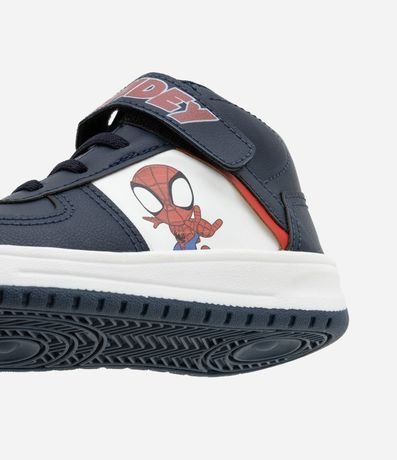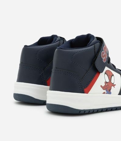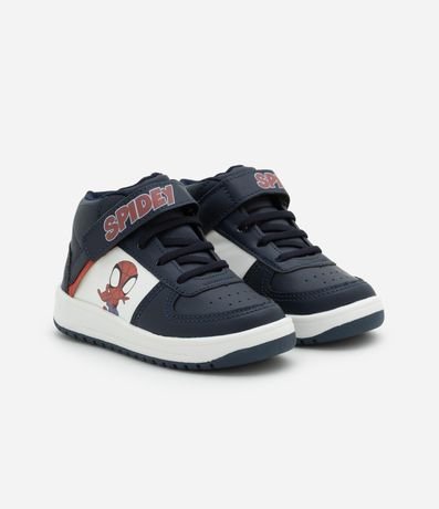 Tênis infantil abotinado com cano médio, amarração por cadarço, tira de velcro, recortes e estampa do Homem-Aranha Spidey.