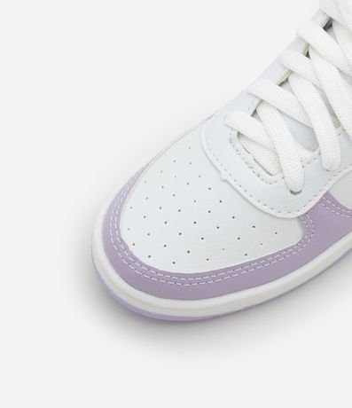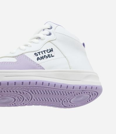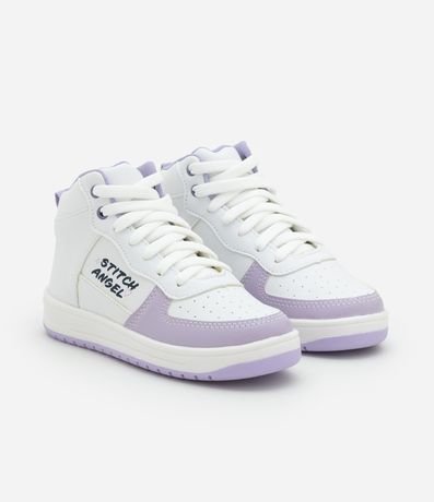 Ref: Tênis infantil abotinado com cano médio, amarração por cadarço, recortes constrastamtes e estampa do Stitch e Angel na parte posterior.
