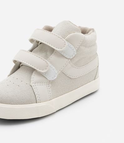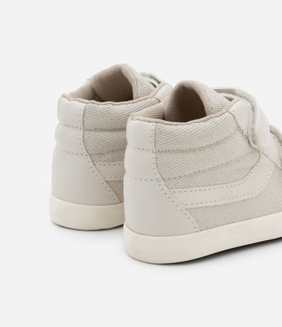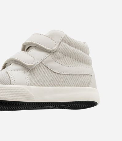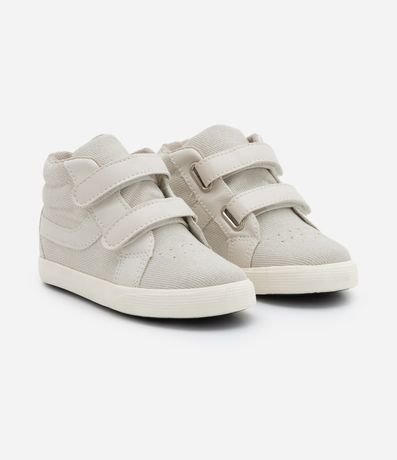 Tênis infantil abotinado com tiras de velcro, cano médio e recortes contrastantes nas laterais.