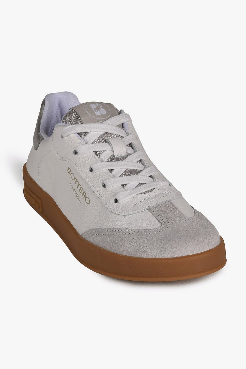 O Tênis Feminino Bottero Michele é confeccionado em couro napa branco de alta qualidade, garantindo sofisticação e conforto. Apresenta um solado rasteiro bege, que proporciona leveza e estilo ao calçado. O modelo conta com fechamento em cadarços brancos, assegurando um ajuste firme e confortável. O charme adicional fica por conta do logo da marca na lateral externa do pé, além do elegante detalhe em couro camurça na parte frontal e acabamento em couro metalizado Roma prata na parte traseira, que confere um toque de modernidade e brilho ao design.
