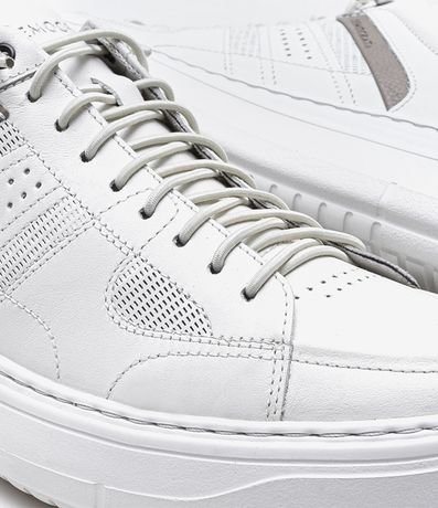 Tênis masculino casual, confeccionado em couro, cano médio, com recortes, fechamento frontal e tag lateral.