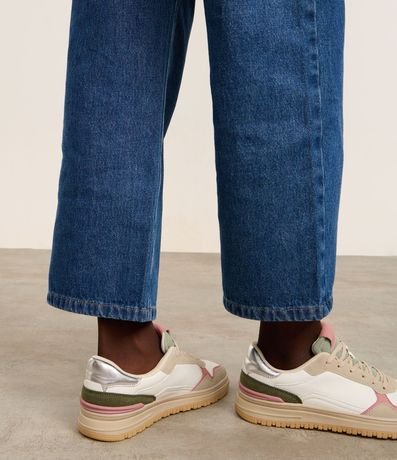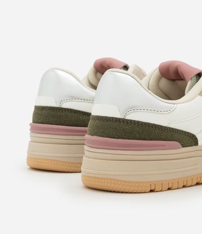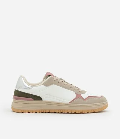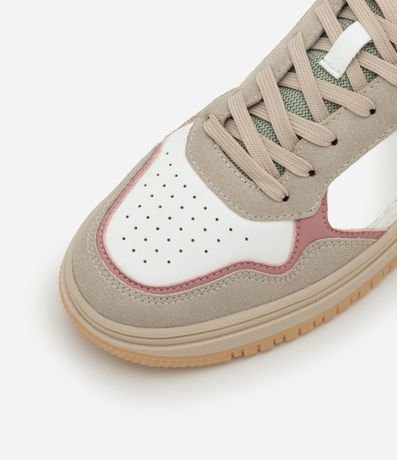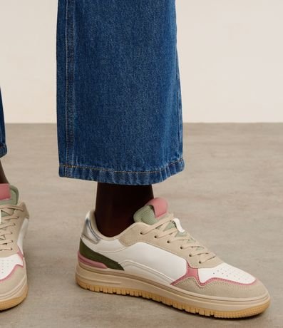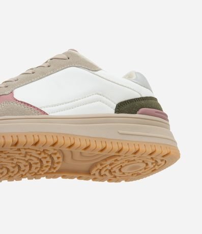 Ref: Tênis feminino confeccionado em material sintético, com caixa baixa, cadarço, bico redondo e detalhe contrastantes de recortes assimétricos.