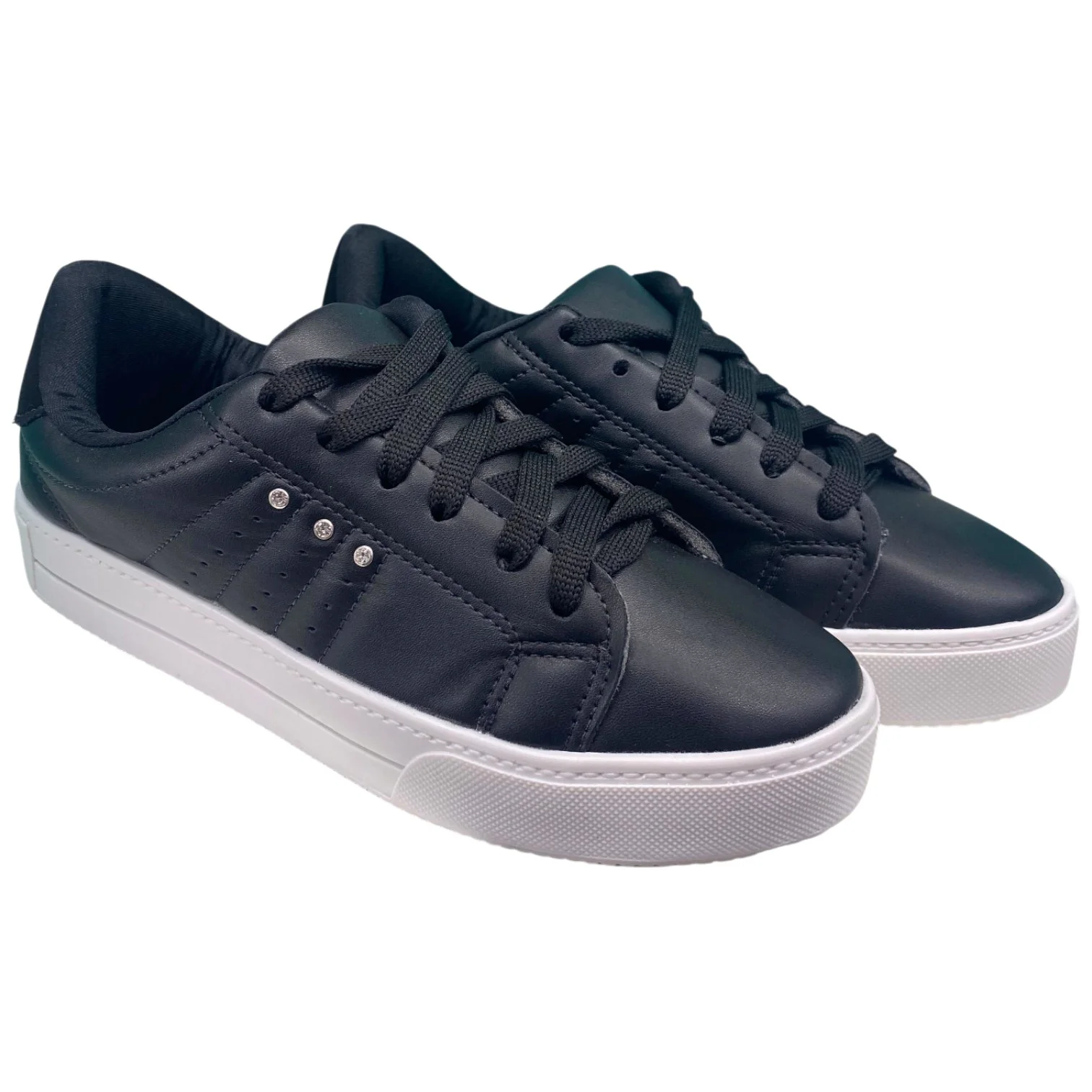 O Tênis Feminino Skynner C001 oferece uma combinação perfeita de estilo e conforto. Confeccionado com material sintético leve e resistente, possui fechamento com cadarços que proporcionam ajuste personalizado e seguro. O destaque fica por conta dos três apliques laterais de strass, que trazem brilho sofisticado e detalhes modernos ao visual. Seu solado macio e antiderrapante garante segurança e conforto durante o uso diário, ideal para quem busca um calçado versátil para o dia a dia.