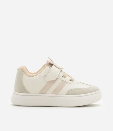 Tênis infantil de modelo casual, com bico redondo e recortes contrastantes. Possui tira de velcro com patch de coelhinho e fechamento por cadarço.