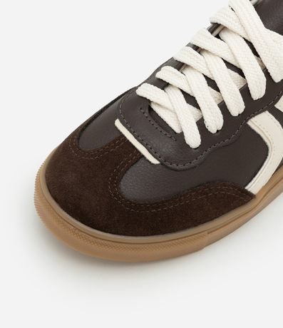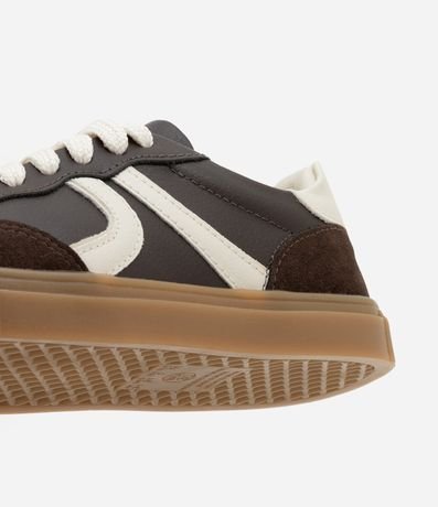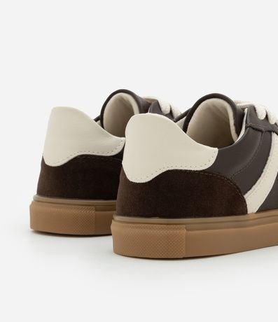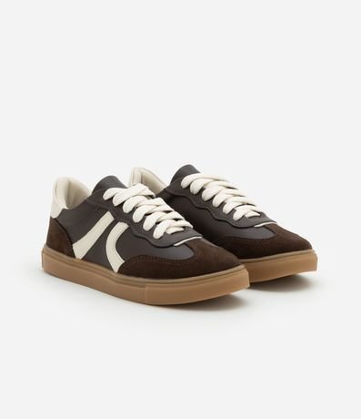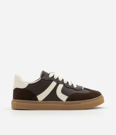 Tênis infantil de modelo casual, com bico redondo e recortes contrastantes. Possui composição em material sintético e fechamento por cadarço.