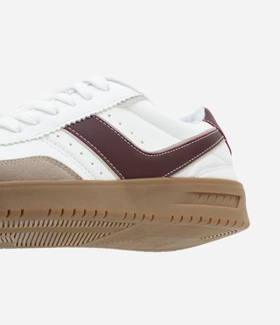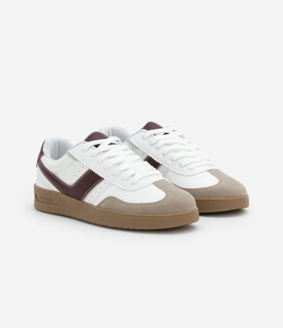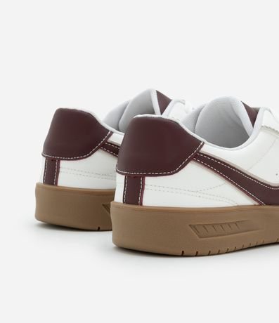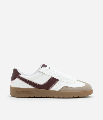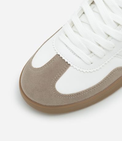 Ref: Tênis feminino chuteira com bico redondo, cadarço, recortes contrastantes e sola baixa.