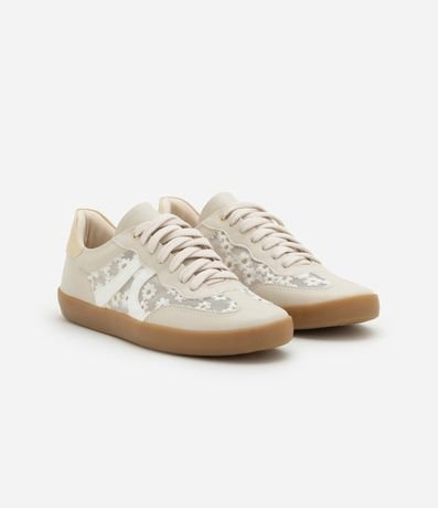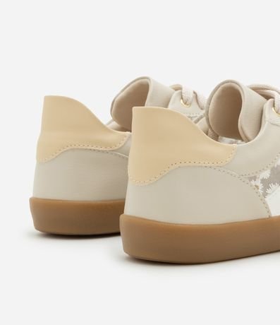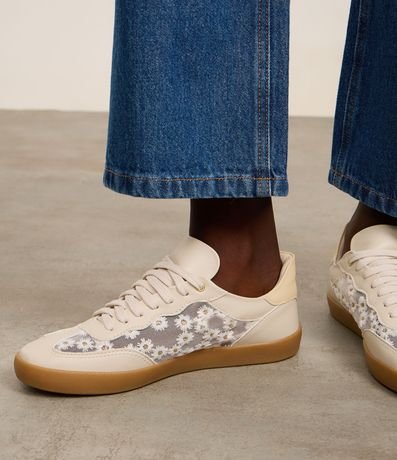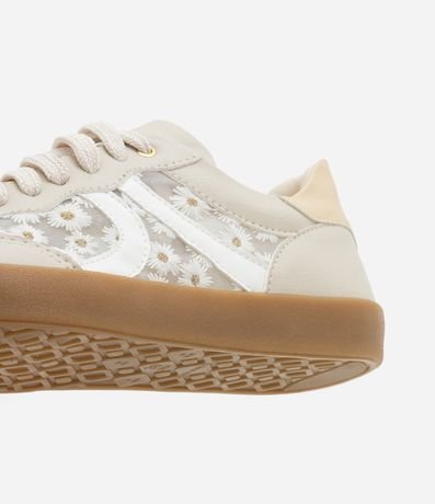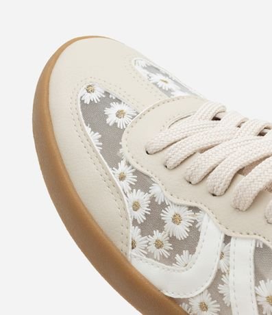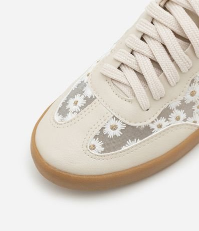 Ref: Tênis feminino chuteira com bico redondo, cadarço, detalhe fofo nas laterais de recortes com tela e flores bordadas.