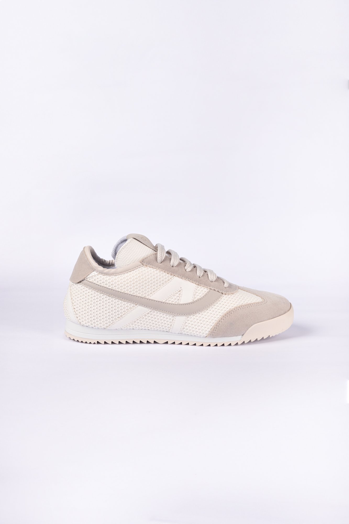 Sua construção mescla materiais com textura (como mesh respirável e camurça soft-touch), criando um jogo visual monocromático em tons neutros de areia, off e branco. O resultado é um sneaker atemporal, mas com personalidade.