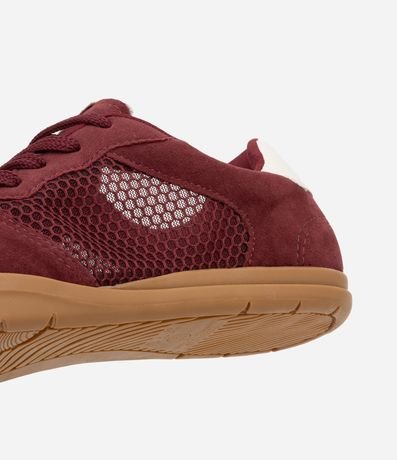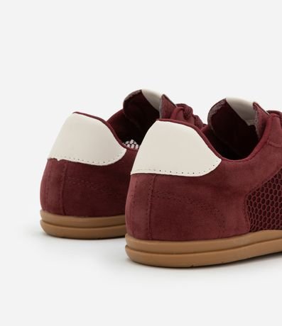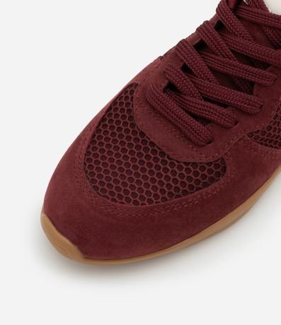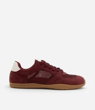 Tênis chuteira feminino casual confeccionado em camurça com bico redondo, detalhe de telinha e recortes contrastantes.