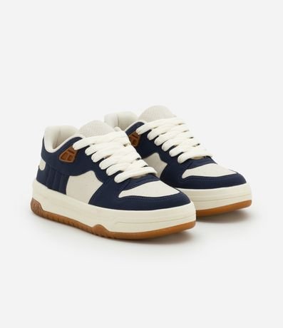 Tênis feminino, confeccionado em PU, com fechamento em cadarço. A peça conta com detalhes contrastantes e sola um pouco mais alta.
