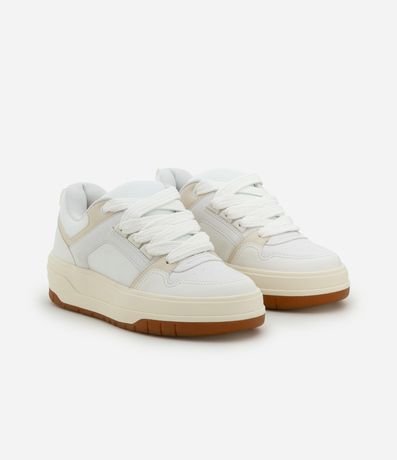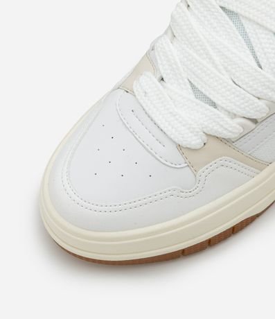 Ref: Tênis feminino confeccionado em material sintético com bico redondo, cadarço frontal, recortes e sola baixa.
