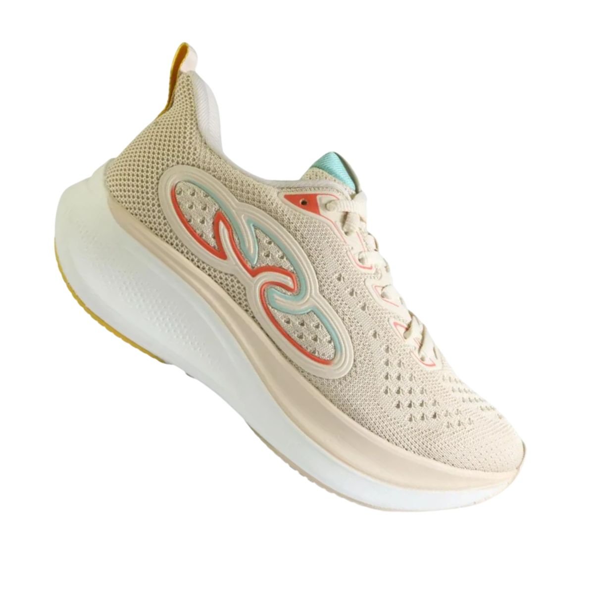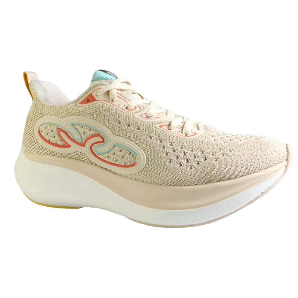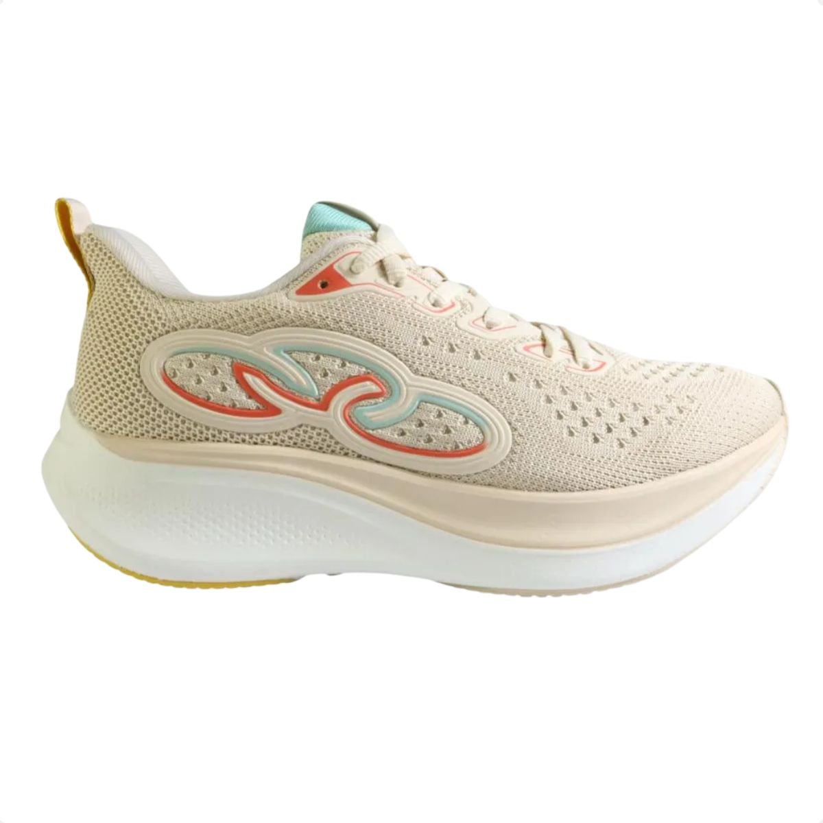 O Olympikus Voa 3 feminino apresenta design esportivo moderno, com combinação de tons neutros como bege (arenito/off-white) e detalhes em cores contrastantes, agregando estilo ao visual esportivo ou casual.