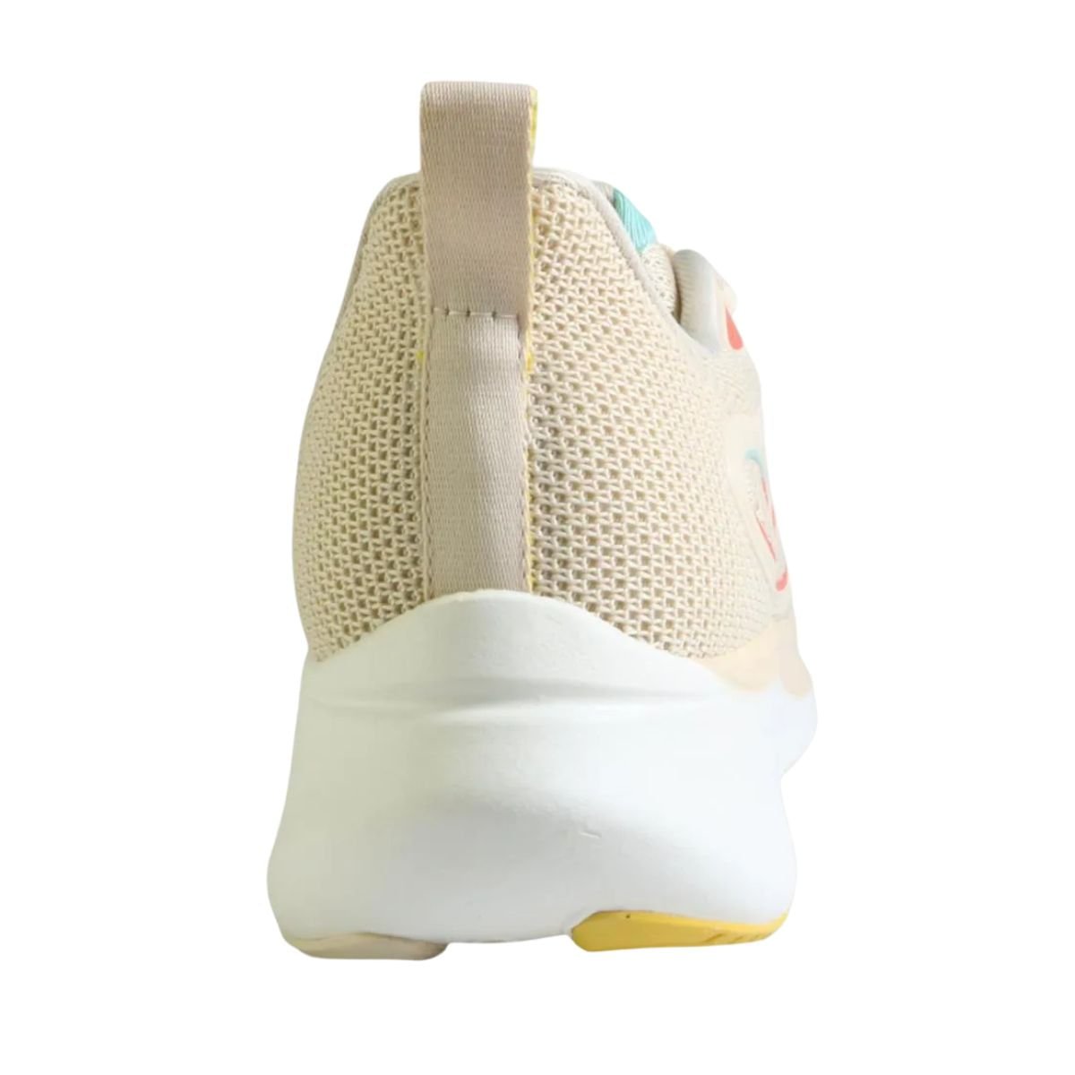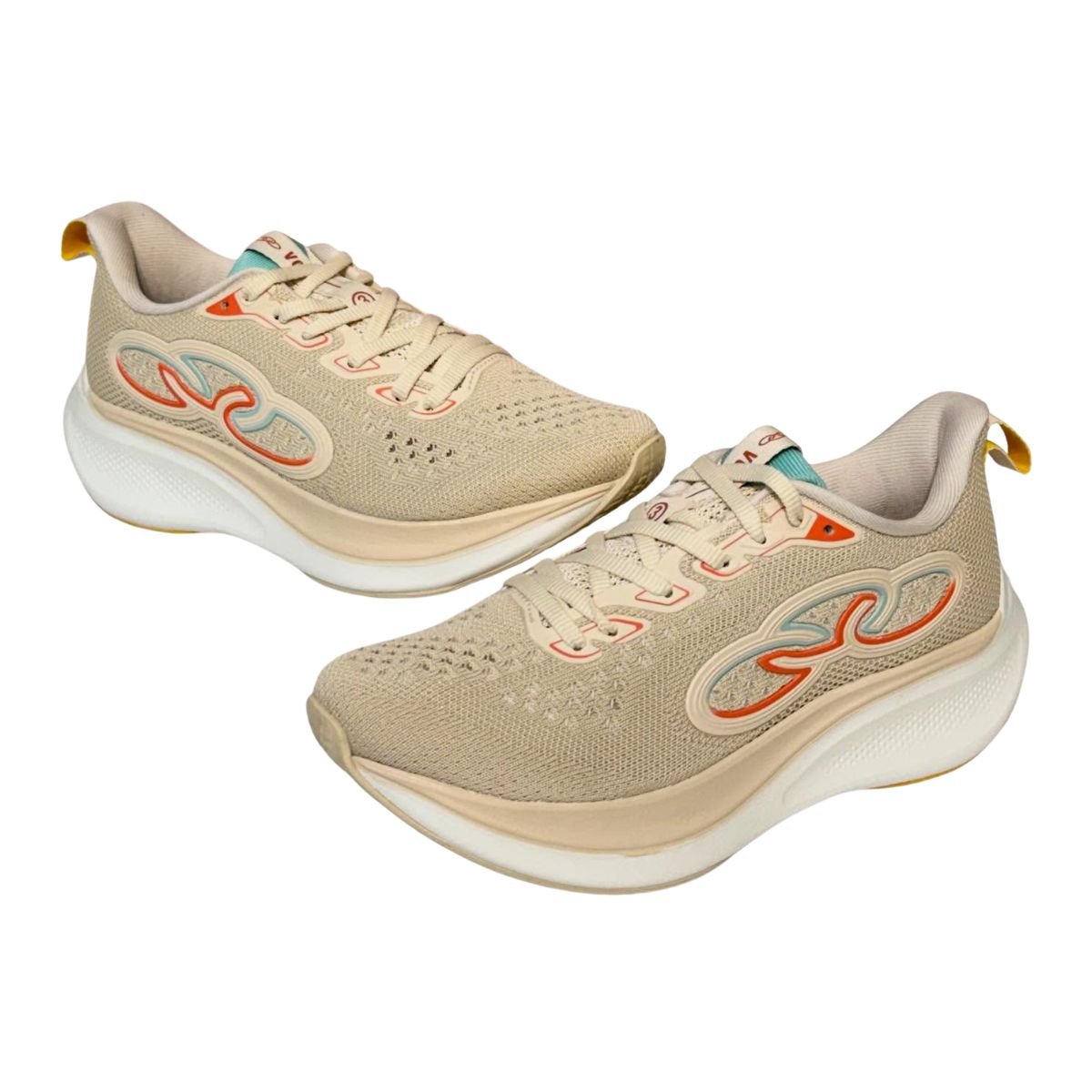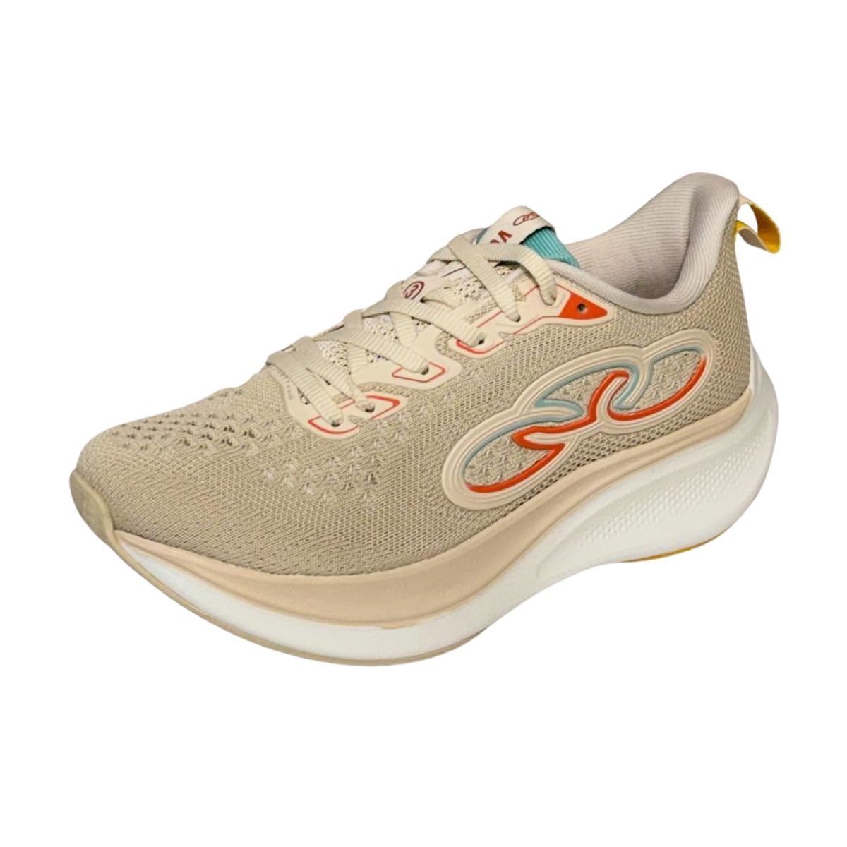 O Olympikus Voa 3 feminino apresenta design esportivo moderno, com combinação de tons neutros como bege (arenito/off-white) e detalhes em cores contrastantes, agregando estilo ao visual esportivo ou casual.