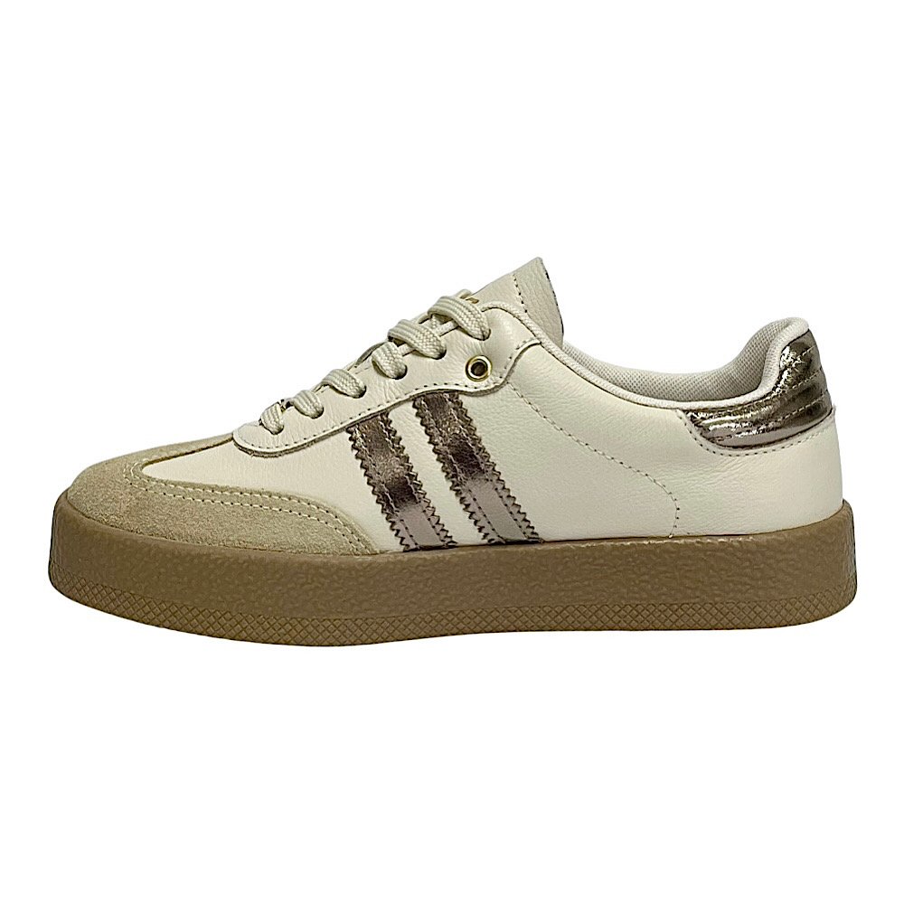 Na versão off white com champagne, o Tênis Thais ganha um ar refinado e luminoso, perfeito para quem deseja unir elegância e casualidade em um único calçado. O brilho discreto do tom champagne contrasta suavemente com a base clara, resultando em um design moderno e cheio de sofisticação. Seu solado flatform de 3,0 centímetros emborrachado garante conforto prolongado e estabilidade a cada passo.