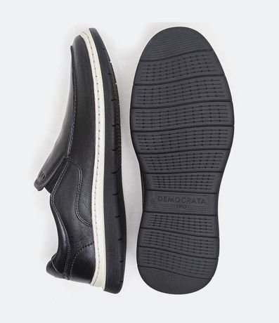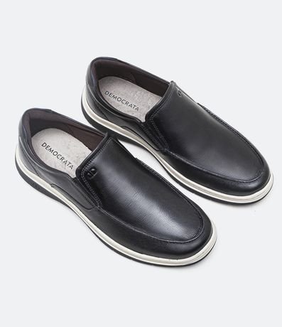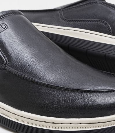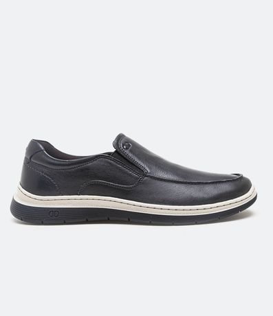 Ref: Tênis masculino, confeccionado em couro, com bico arredondado, detalhes em pespontos e sem fechamento.