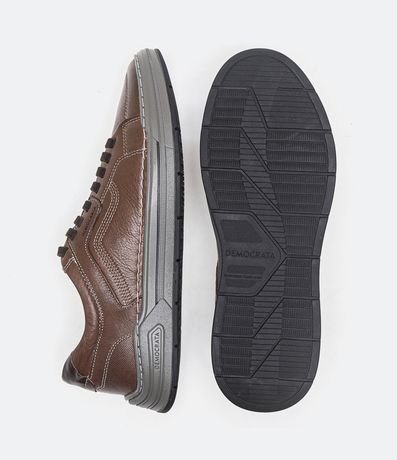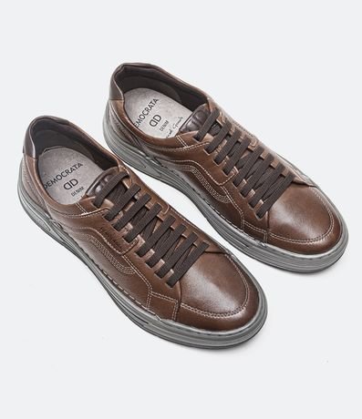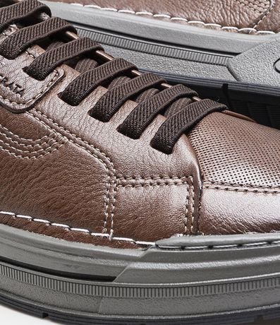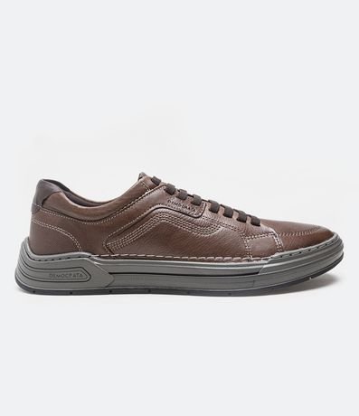 Ref: Tênis masculino, confeccionado em couro, com fechamento em cadarço e recortes pespontados.