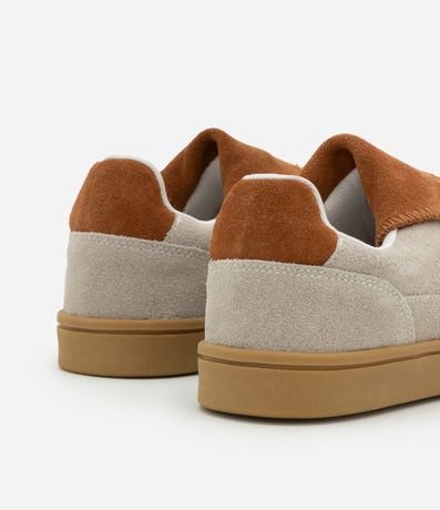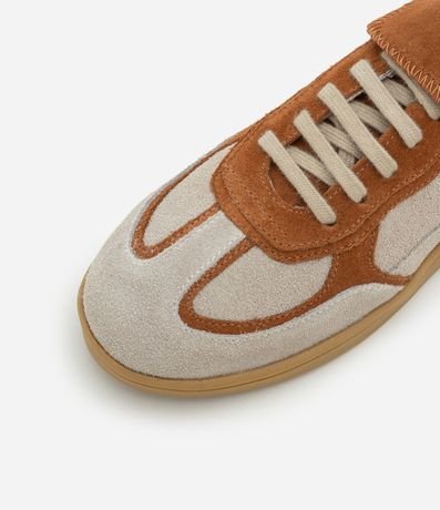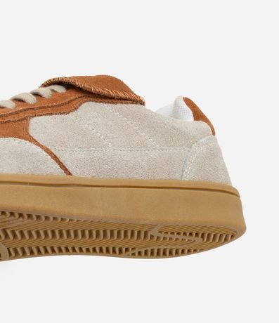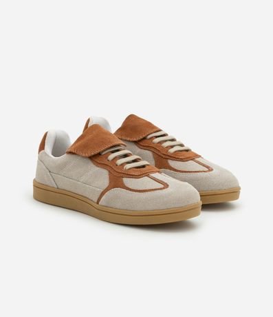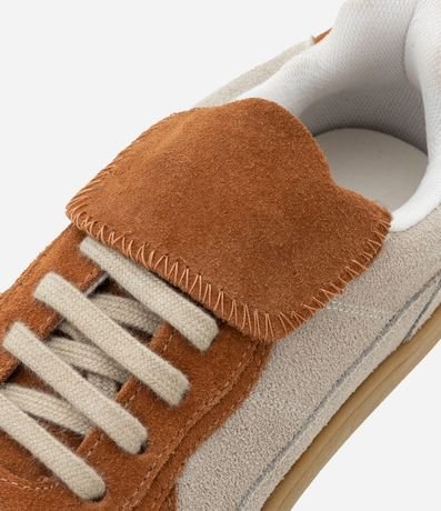 Ref: Tênis com salto baixo, confeccionado em couro, lingueta alongada e fechamento por cadarço.