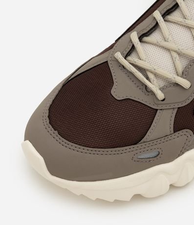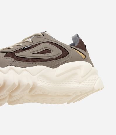 Tênis masculino, confeccionado em PU, com fechamento em cadarço, recortes e texturas.