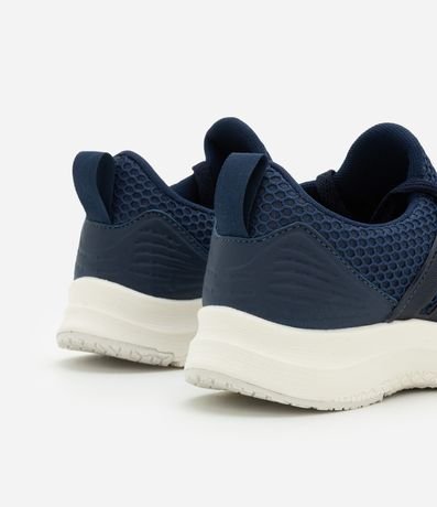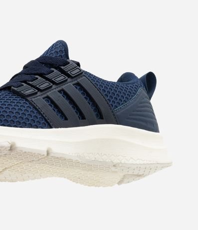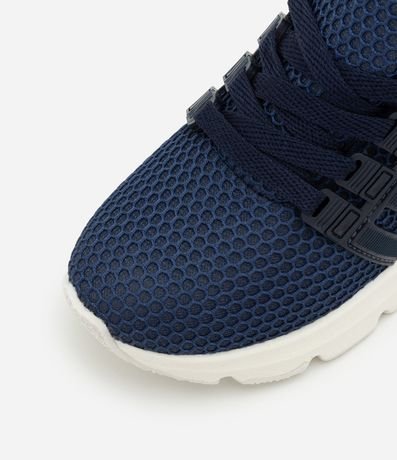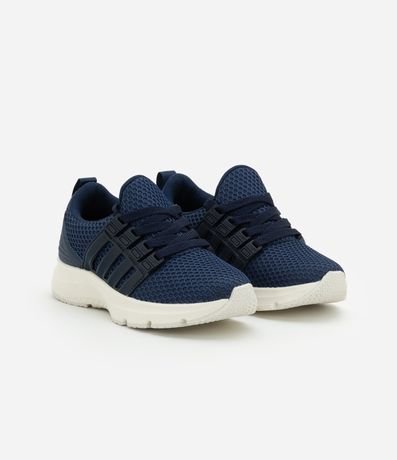 Ref: Tênis infantil de modelo esportivo, com bico redondo e sem estampa. Possui textura de telinha, recortes e detalhe lateral emborrachado. Seu fechamento se dá por amarração em cadarço e sua composição é de poliéster.