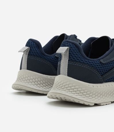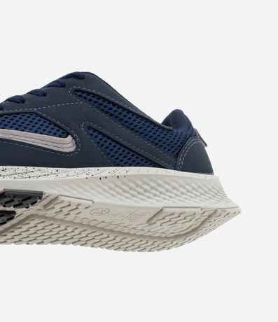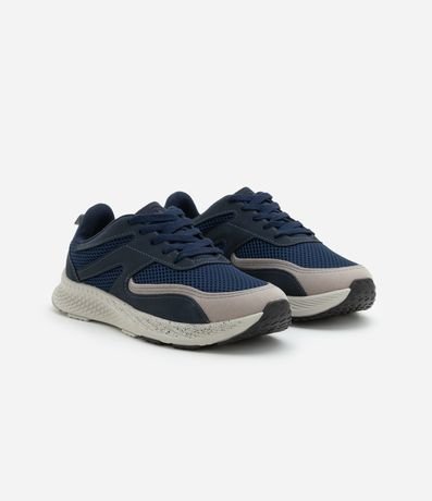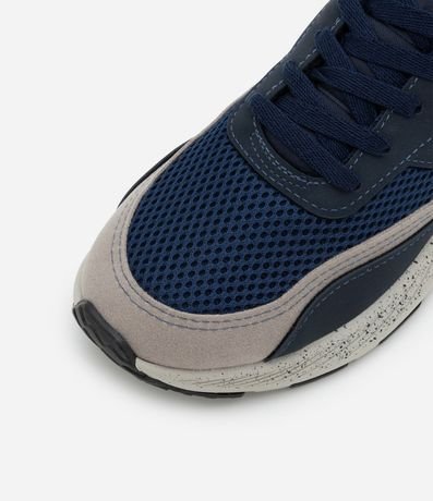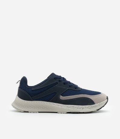 Ref: Tênis infantil de modelo esportivo, confeccionado em material sintético, com recortes contrastantes, detalhe de "respingos" no solado e fechamento por cadarço.