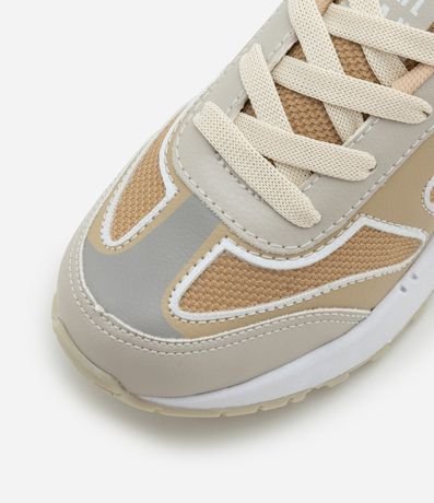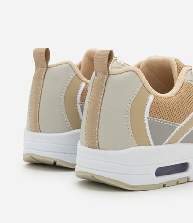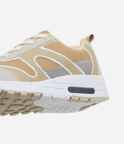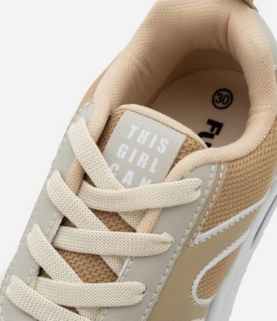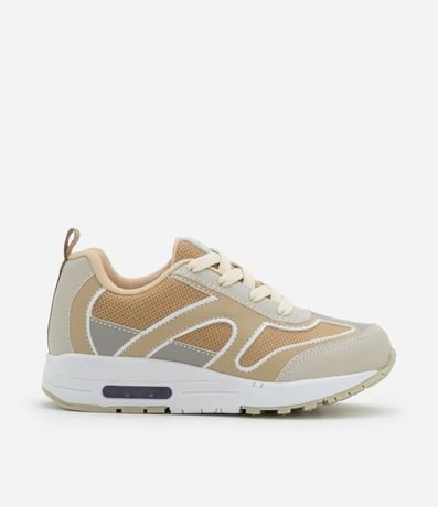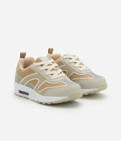 Tênis infantil de modelo esportivo, confeccionado em material sintético, com recortes contrastantes, solado com "bolha transparente" e fechamento por cadarço.