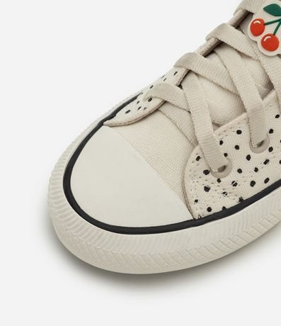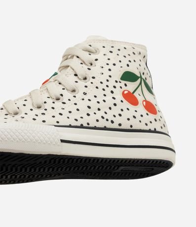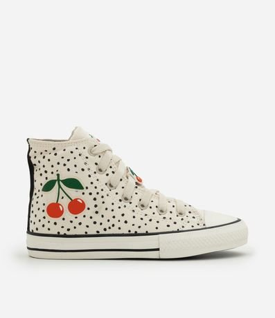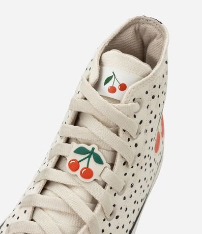Ref: Tênis infantil confeccionado em poliéster com estrutura leve, cano alto e biqueira reforçada. Possui amarração frontal com cadarços, palmilha macia e solado em borracha vulcanizada para maior aderência. Apresenta estampa de cerejas e pin decorativo aplicado nos cadarços, trazendo charme lúdico ao visual.