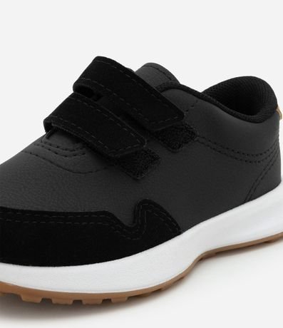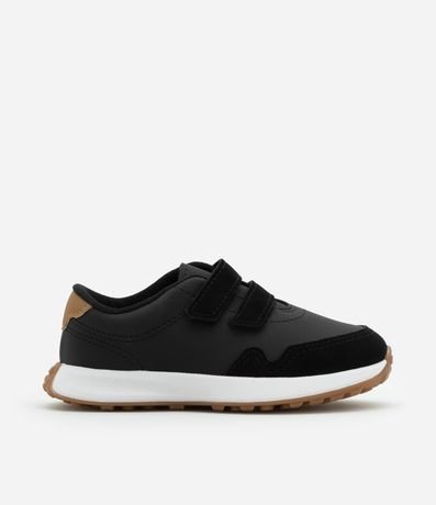 Ref: Tênis infantil em material sintético, com fechamento por velcro, bico redondo e solado caixa baixa. Possui recortes e detalhe de bolinhas na sola.
