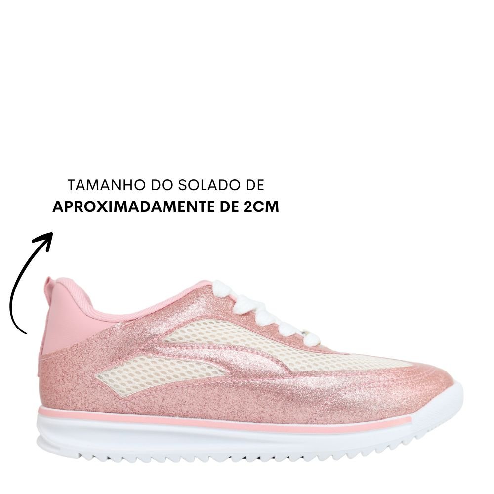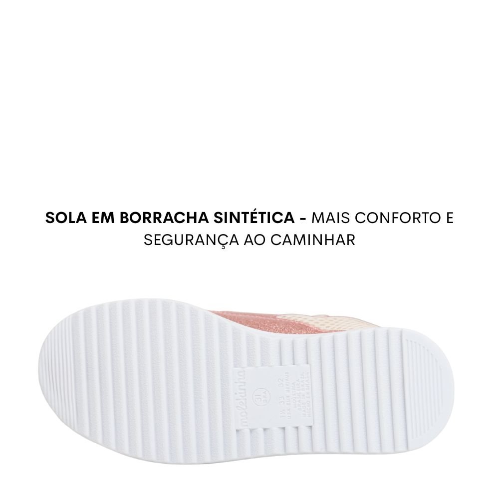 Seu visual delicado e atual combina facilmente com diversos looks infantis. O solado emborrachado com frisos antiderrapantes oferece maior segurança e estabilidade durante as atividades do dia a dia.