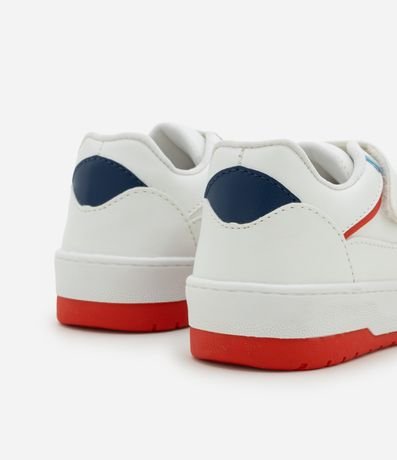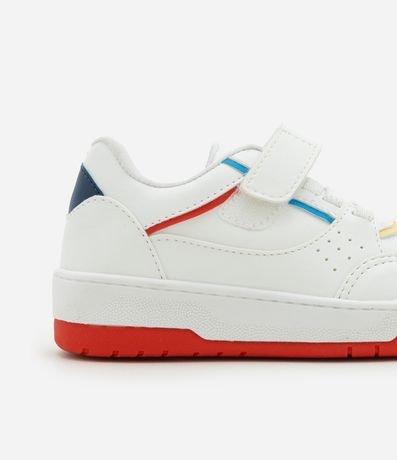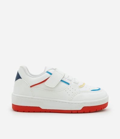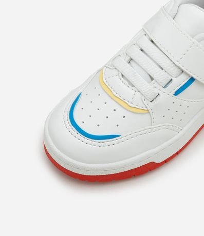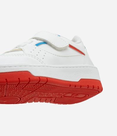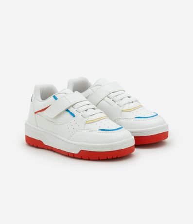 Ref: Tênis infantil confeccionado em material sintético, com recortes contrastantes e fechamento por velcro e cadarço.