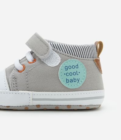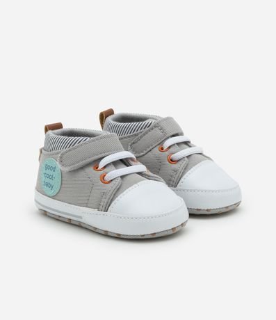 Tênis infantil confeccionado em sarja e com fechamento por  cadarço, velcro e com etiqueta lateral.