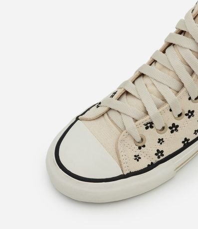 Tênis infantil abotinado confeccionado em lona de algodão, com estampa floral em estilo liberty e fechamento por cadarço. Possui solado vulcanizado, reforço frontal em borracha e puxador traseiro que facilita o calce, garantindo estrutura leve e confortável.