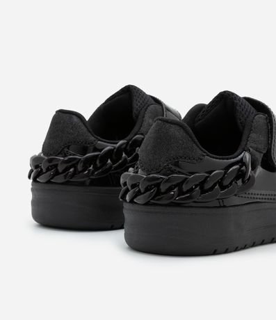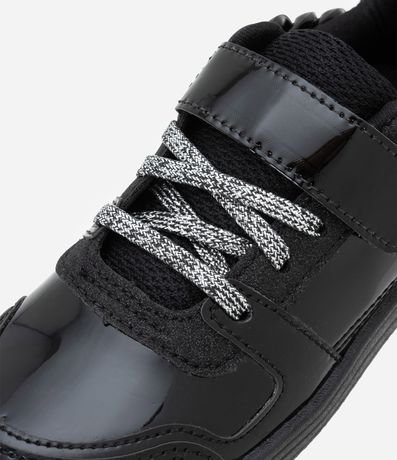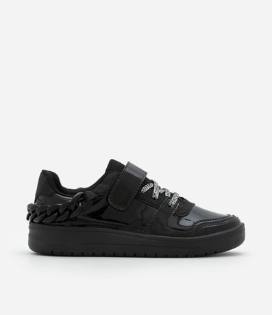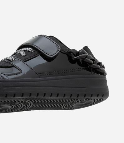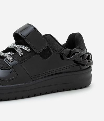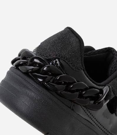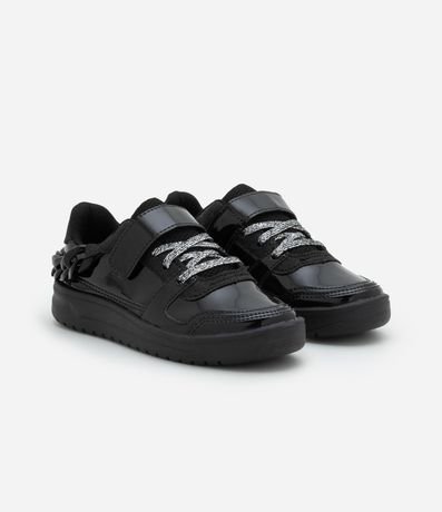 Ref: Tênis infantil com bico redondo e sem estampa. Possui detalhe corrente na parte do calcanhar. Seu fechamento se dá por amarração em cadarço com brilhos e tira de velcro e sua composição é de material sintético.