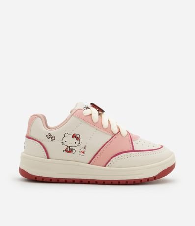 Tênis infantil com cano curto, cadarço para amarração, recortes coloridinhos e carinha da Hello Kitty.