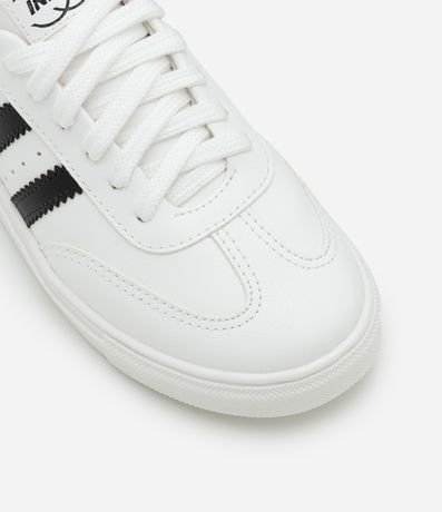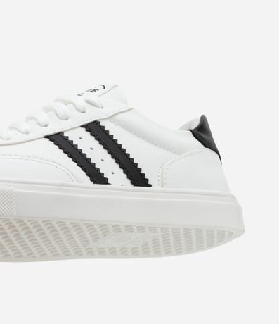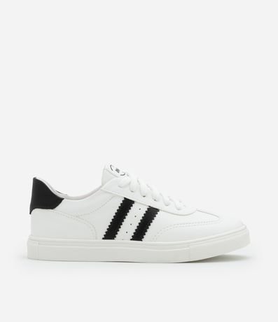 Ref: Tênis infantil confeccionado em material sintético, com bico redondo, recortes e detalhes contrastantes. Possui fechamento por cadarço.